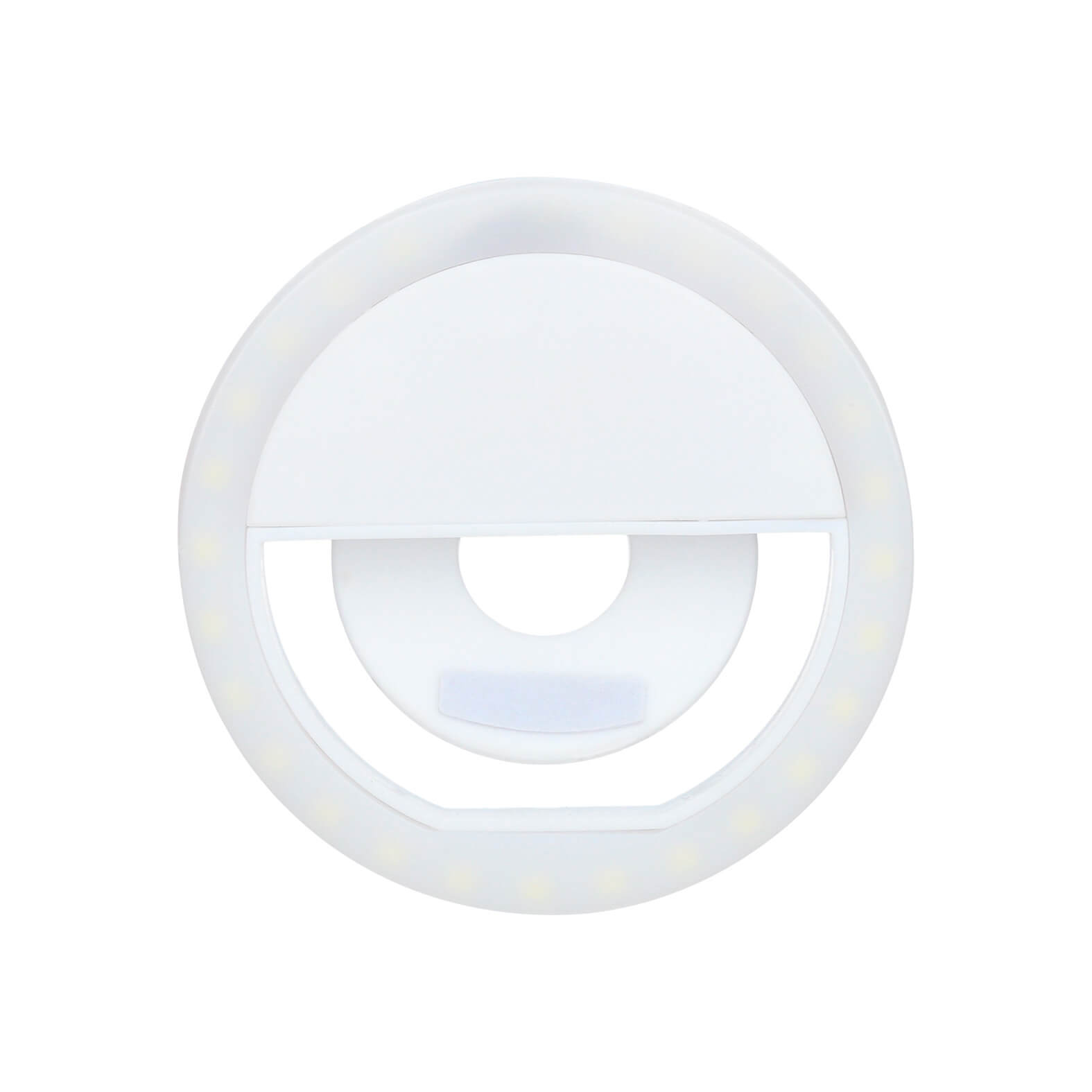 Mini aro de luz LED con clip ajustable para celulares o equipos de cómputo, cuenta con 3 niveles de intensidad. Incluye cable de carga.