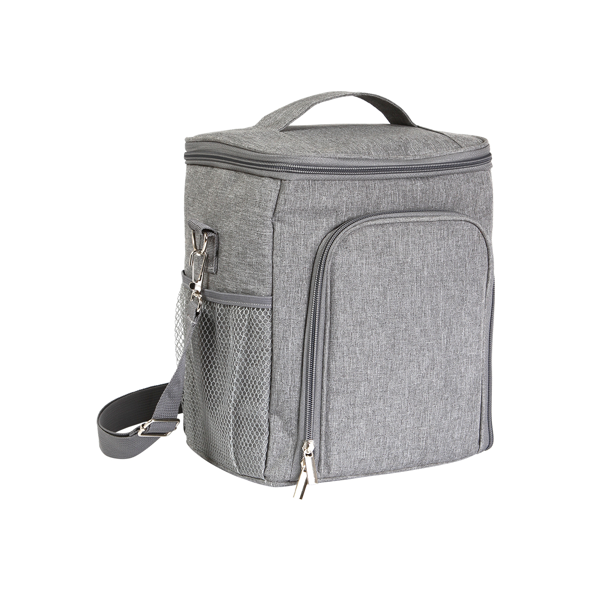 Hielera fabricada en lona, espuma de PE, forro de acetato de vinilo y polietileno (PEVA). Cuenta con doble cierre, bolsas laterales tipo red, asa y correa de hombro.