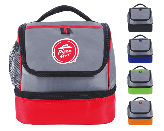 Lonchera / Hielera con cubierta e interior cosido en plástico anti escurrimiento, con 2 compartimentos con cierre, en la parte superior un espacio para guardar, bolsa lateral de malla y asa para transportar.