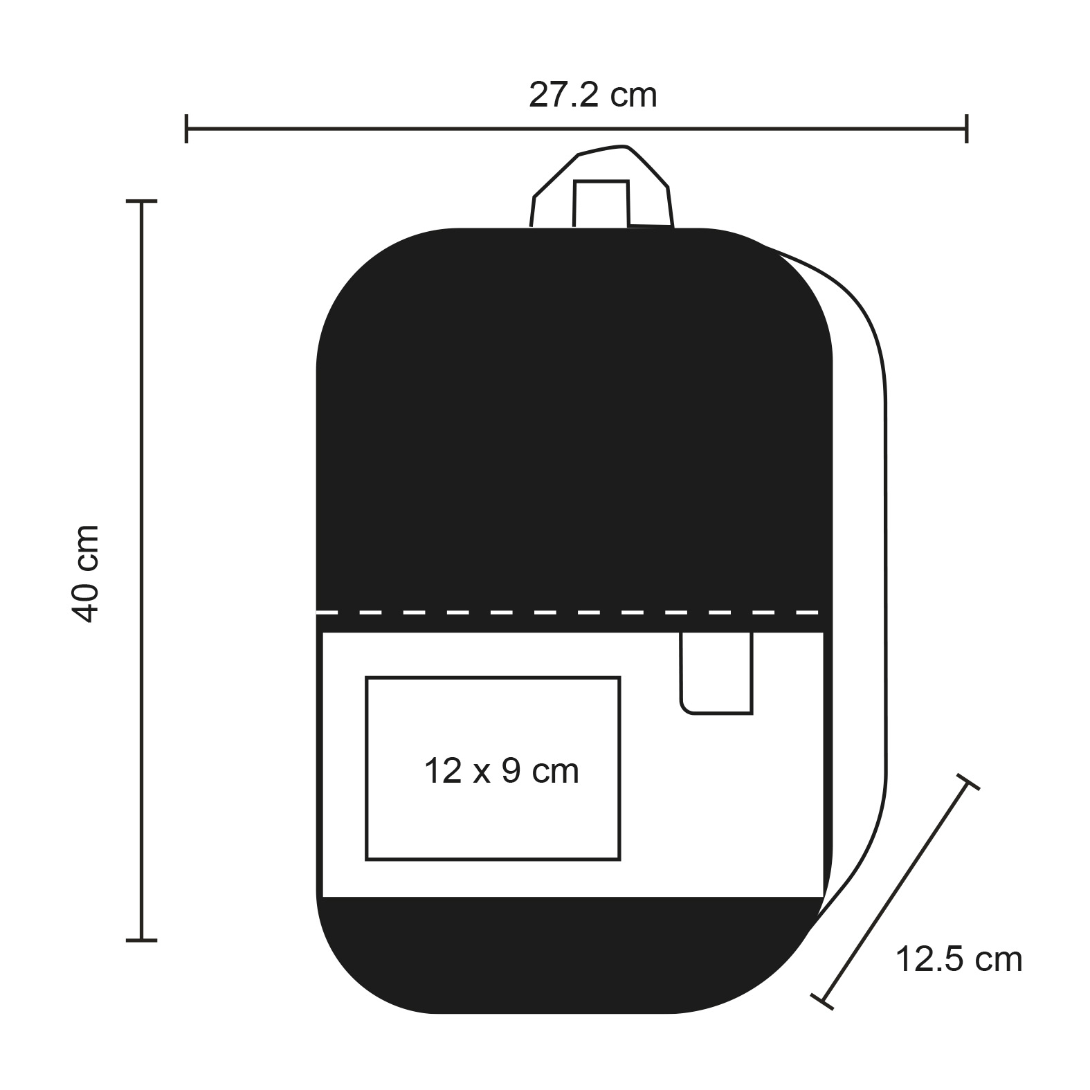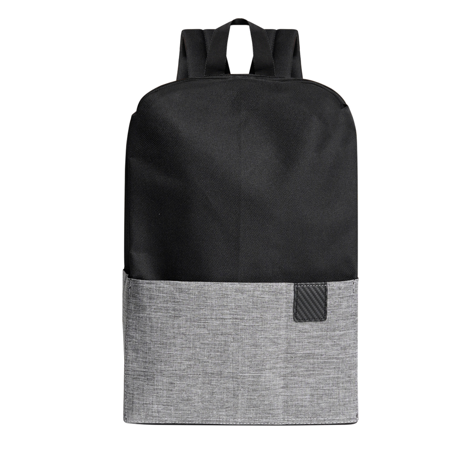 Mochila con compartimento principal y porta laptop, bolsa frontal con cierre, asa superior y correas.