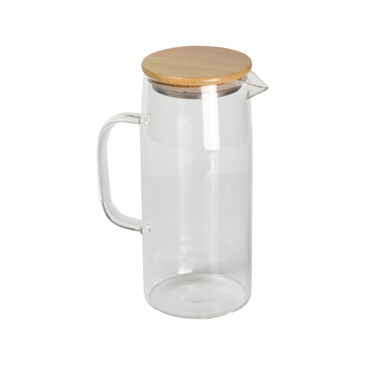 Jarra de vidrio de borosilicato con tapa de bambú. Capacidad de 1000 ml. Incluye caja de cartón individual. Perfecta para preparar y servir bebidas frías.