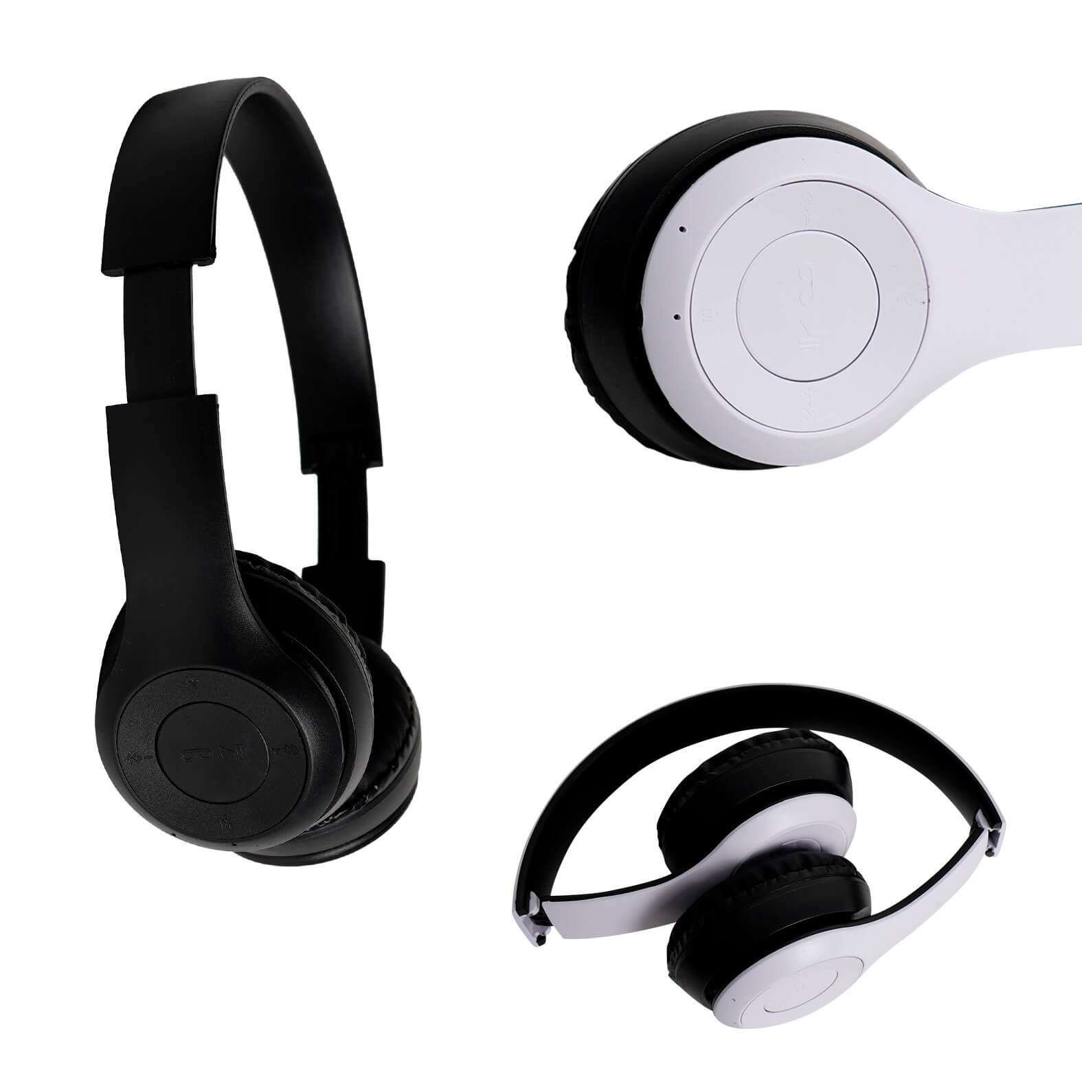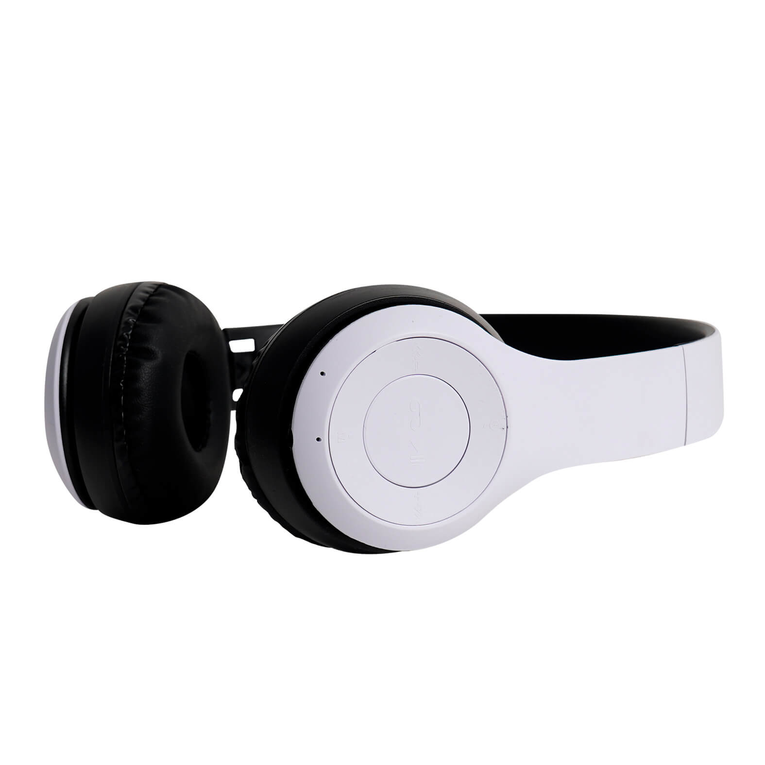 Audífonos inalámbricos plegables con controles táctiles para adelantar/retroceder, reproducir/pausar y ajustar el volumen. Cuentan con orejeras acolchadas, micrófono, entrada auxiliar y radio FM, con tipo de carga micro USB.