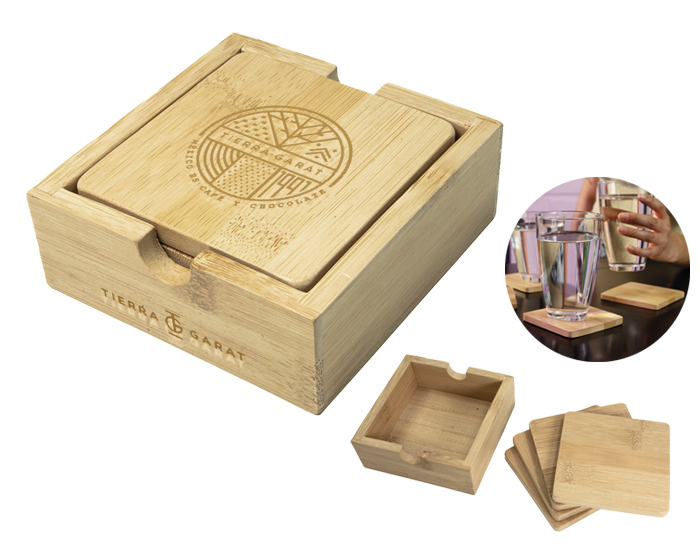 Juego de portavasos de bambú que incluye: 4 portavasos y una base para guardar. Presentación: caja en color blanco.
