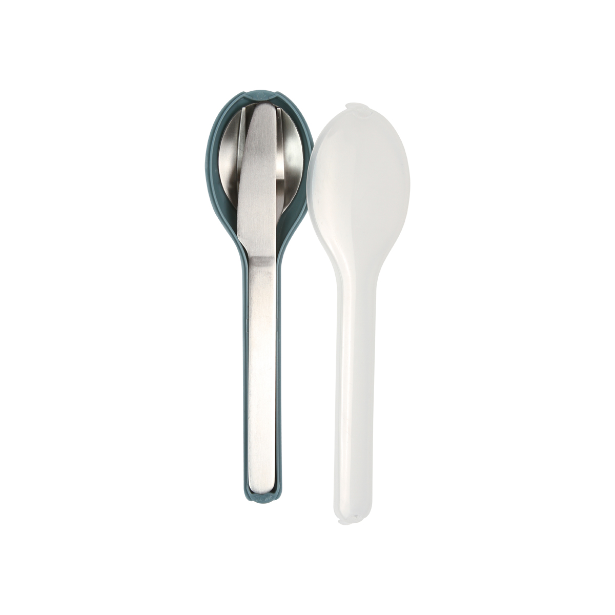 Juego de utensilios fabricados en acero inoxidable, incluye cuchara, tenedor y cuchillo. Su estuche en forma de cuchara fabricado en polipropileno con tapa traslúcida ayuda a resguardarlos mejor.
