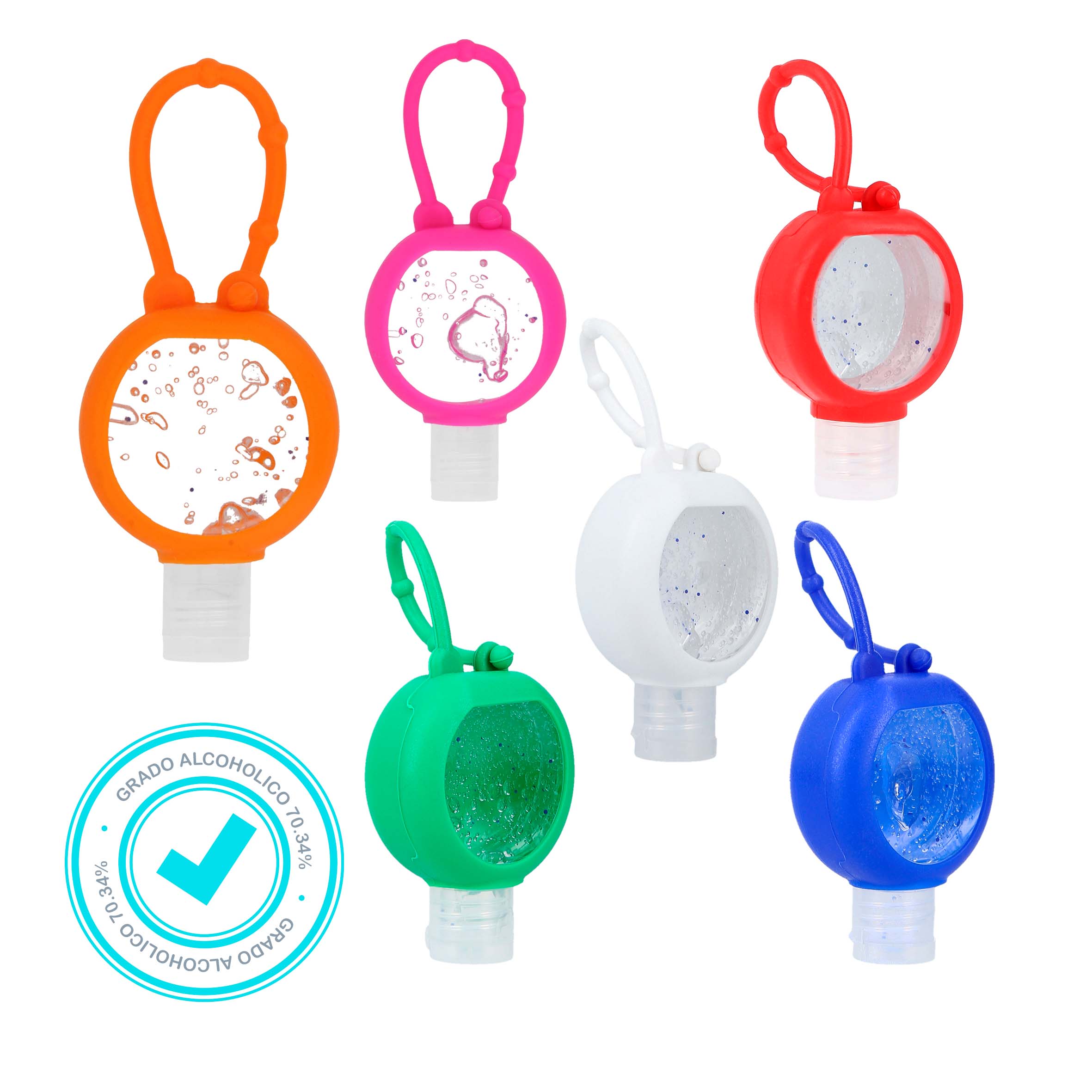 Gel antibacterial en botella de plástico con funda de silicón. Porcentaje de alcohol: 68 %.