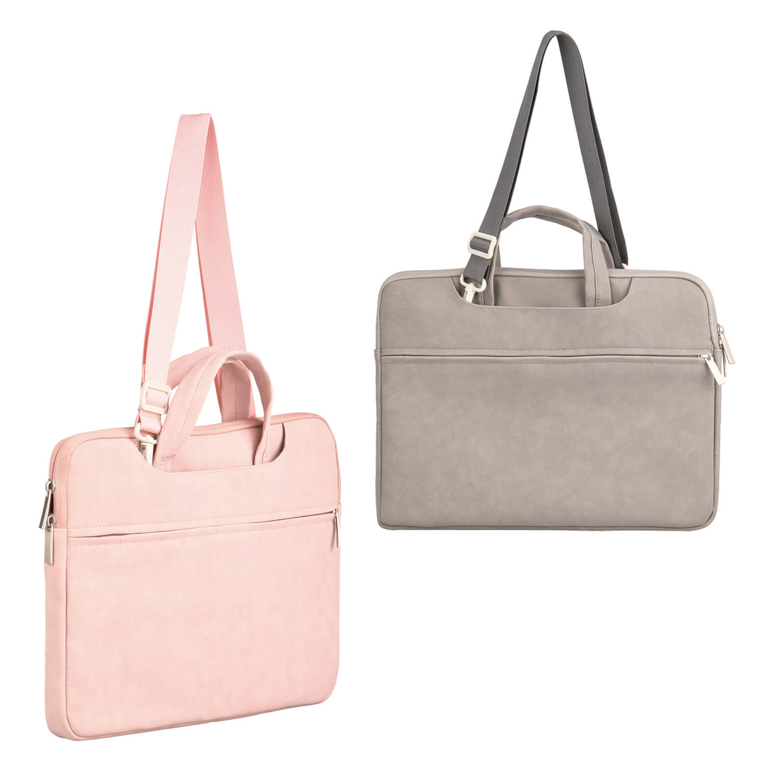 Portafolio con compartimento principal afelpado para laptop de hasta 15″, dos bolsillos para guardar las asas, bolsa frontal con cierre, banda carry-on y correa ajustable.