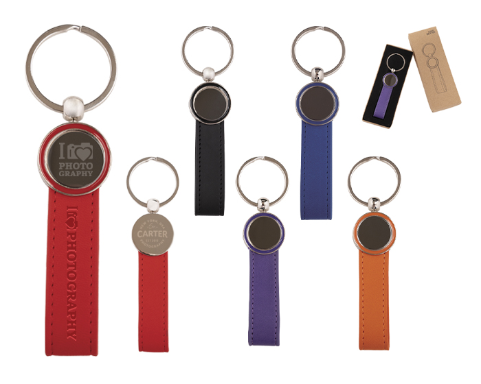Llavero con correa de termo PU y placa de acero inoxidable con arillo reforzado de metal. Presentación: Caja individual de kraft.