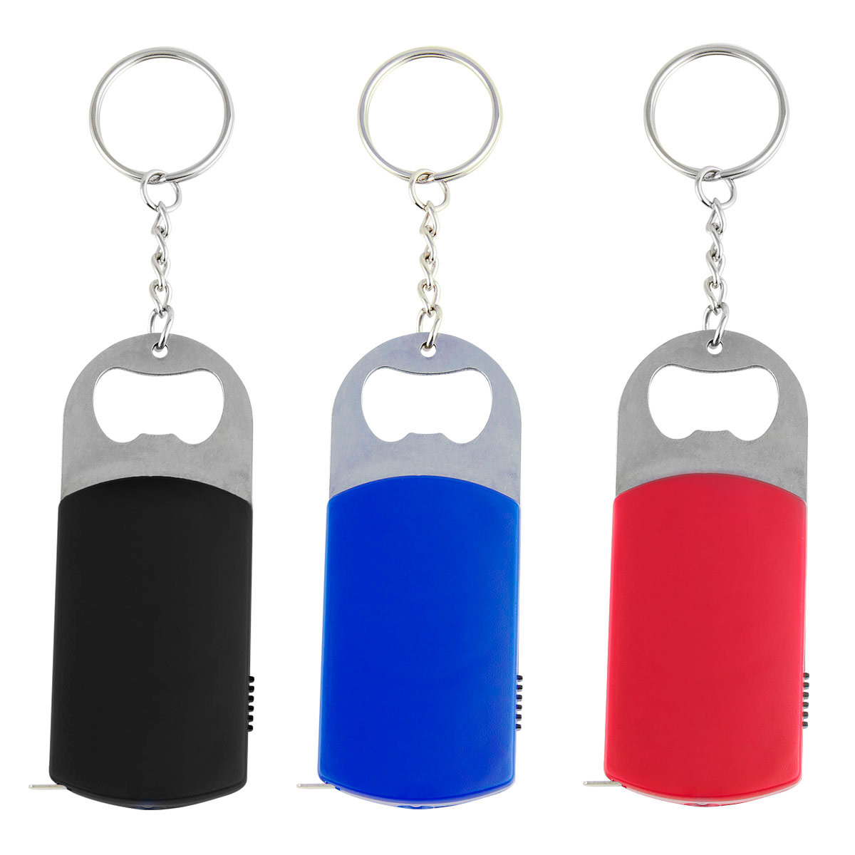 Llavero destapador con lámpara de 1 LED y flexómetro de cinta metálica de 1 m.