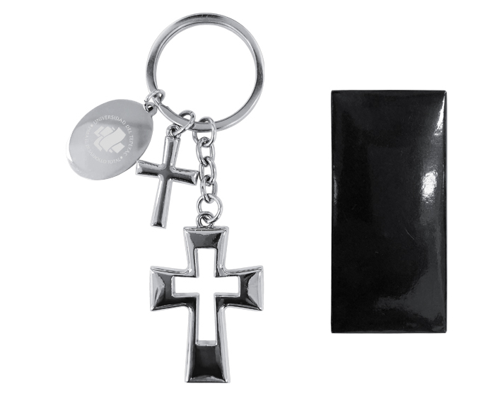 Llavero con 2 cruces y placa de aleación de zinc y arillo reforzado. Presentación: Caja individual de cartón en color negro.