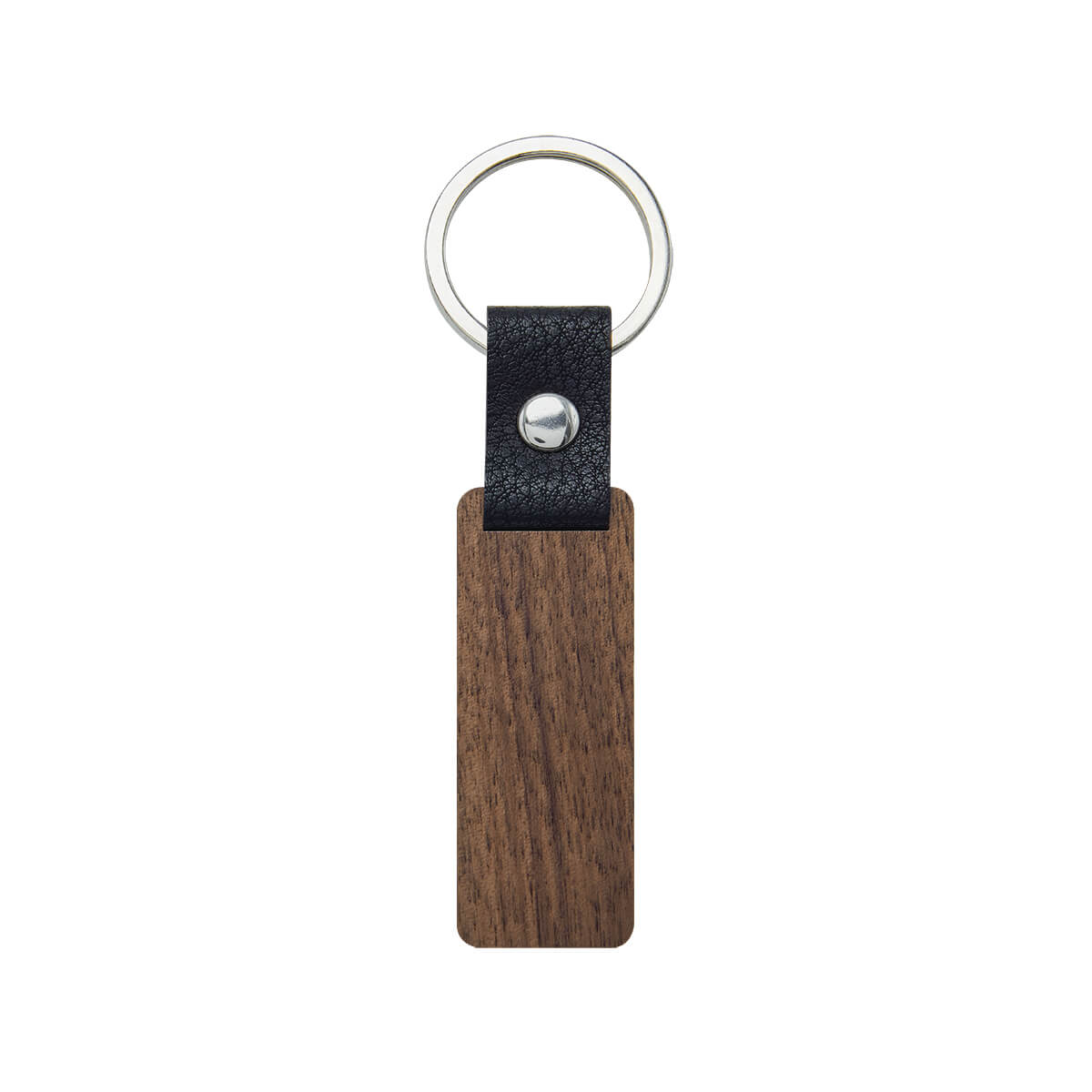Llavero de madera con tira de curpiel. Incluye empaque con exhibidor de cartón y bolsa individual.