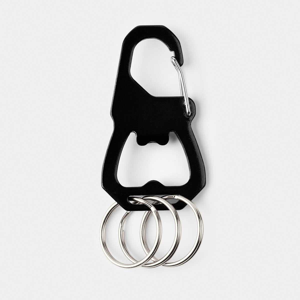 Llavero metálico multifunción con gancho, destapador y tres aros para llaves. Organiza y transporta tus llaves con un accesorio práctico y de uso diario.