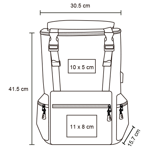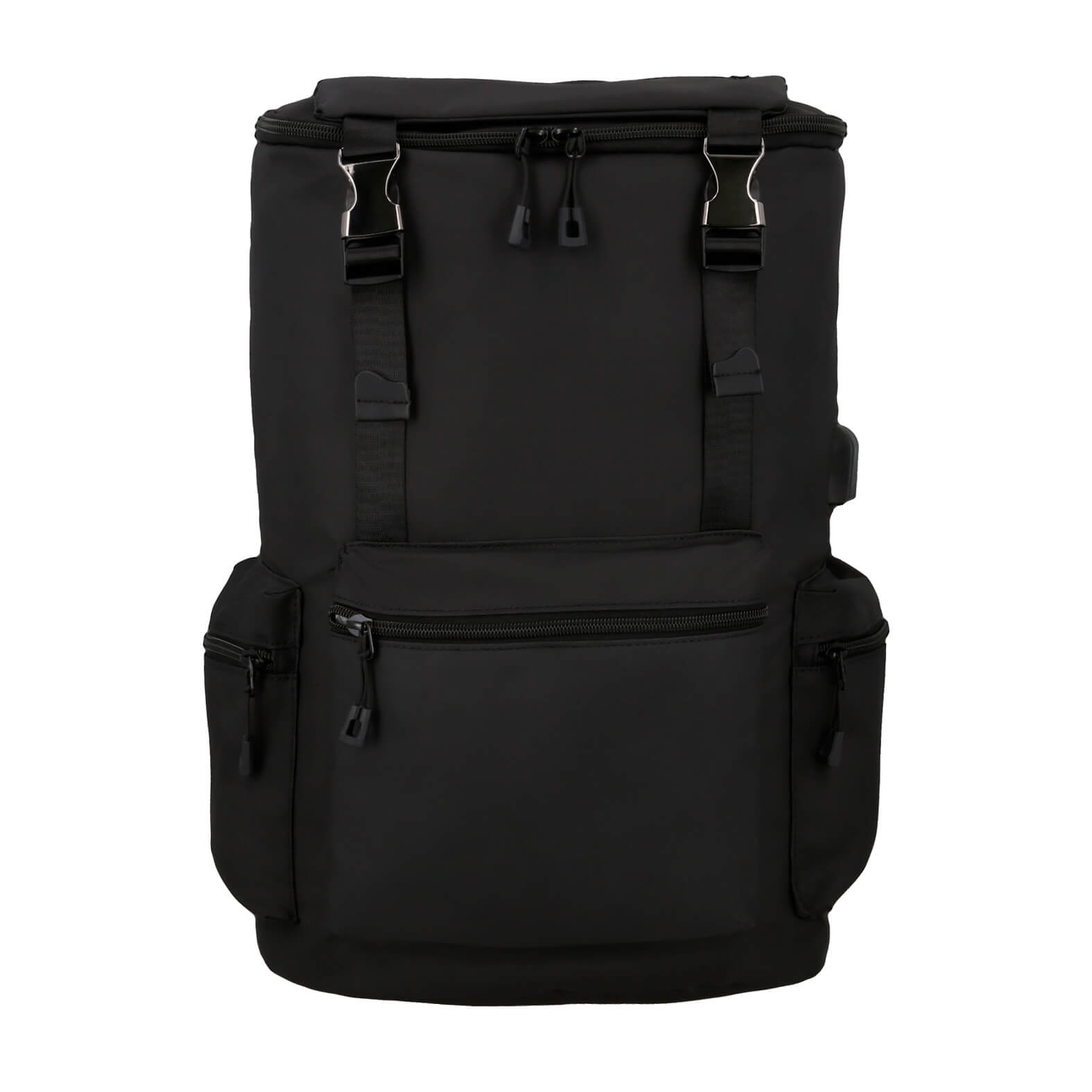 Mochila de 1 compartimento principal con espacio para porta laptop, 1 bolsa interna, 1 bolsa frontal, dos bolsas laterales con cierre, 1 bolsa en parte superior, broches, carry on y asa superior.
