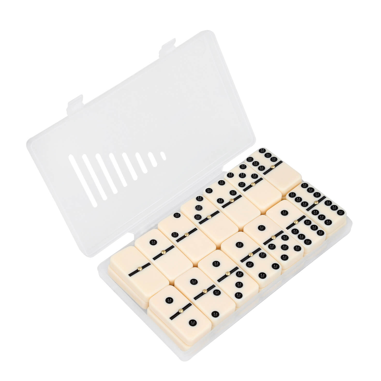 Dominó con 28 fichas y estuche de plástico.
