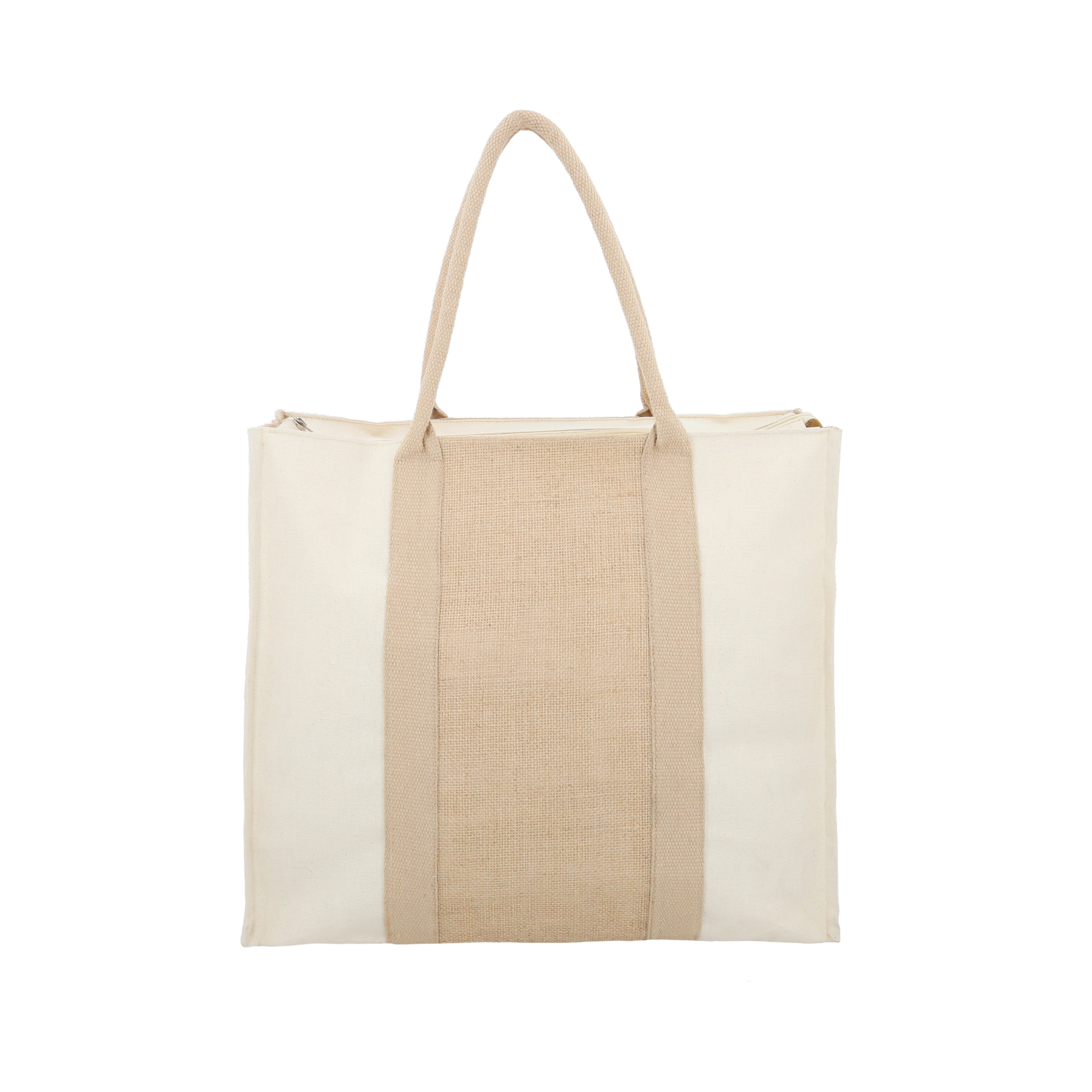 Bolsa de yute con loneta, interior laminado con asas, fuelle y cierre.
