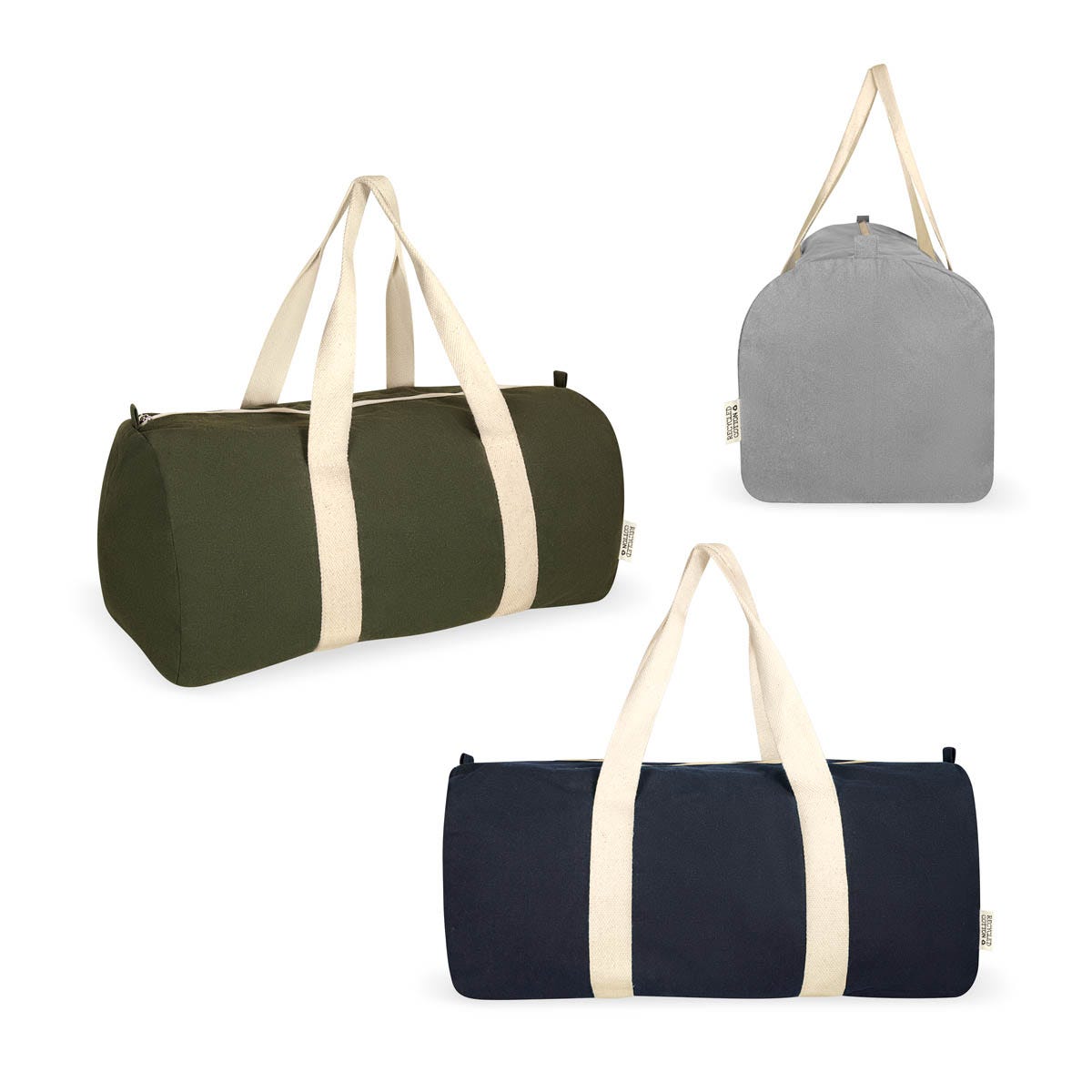 Maleta ecológica fabricada con algodón reciclado. Cuenta con un compartimento principal con cierre y dos asas para hombro.