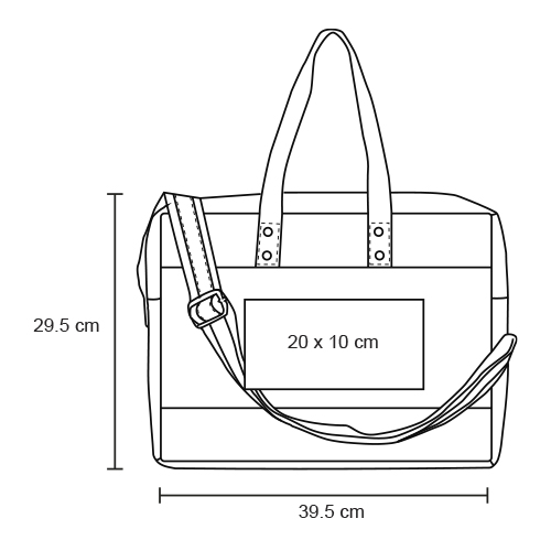 Portafolio de yute laminado con interior de algodón, 1 compartimento con broche de velcro para porta laptop, cierre, correa ajustable y asas.