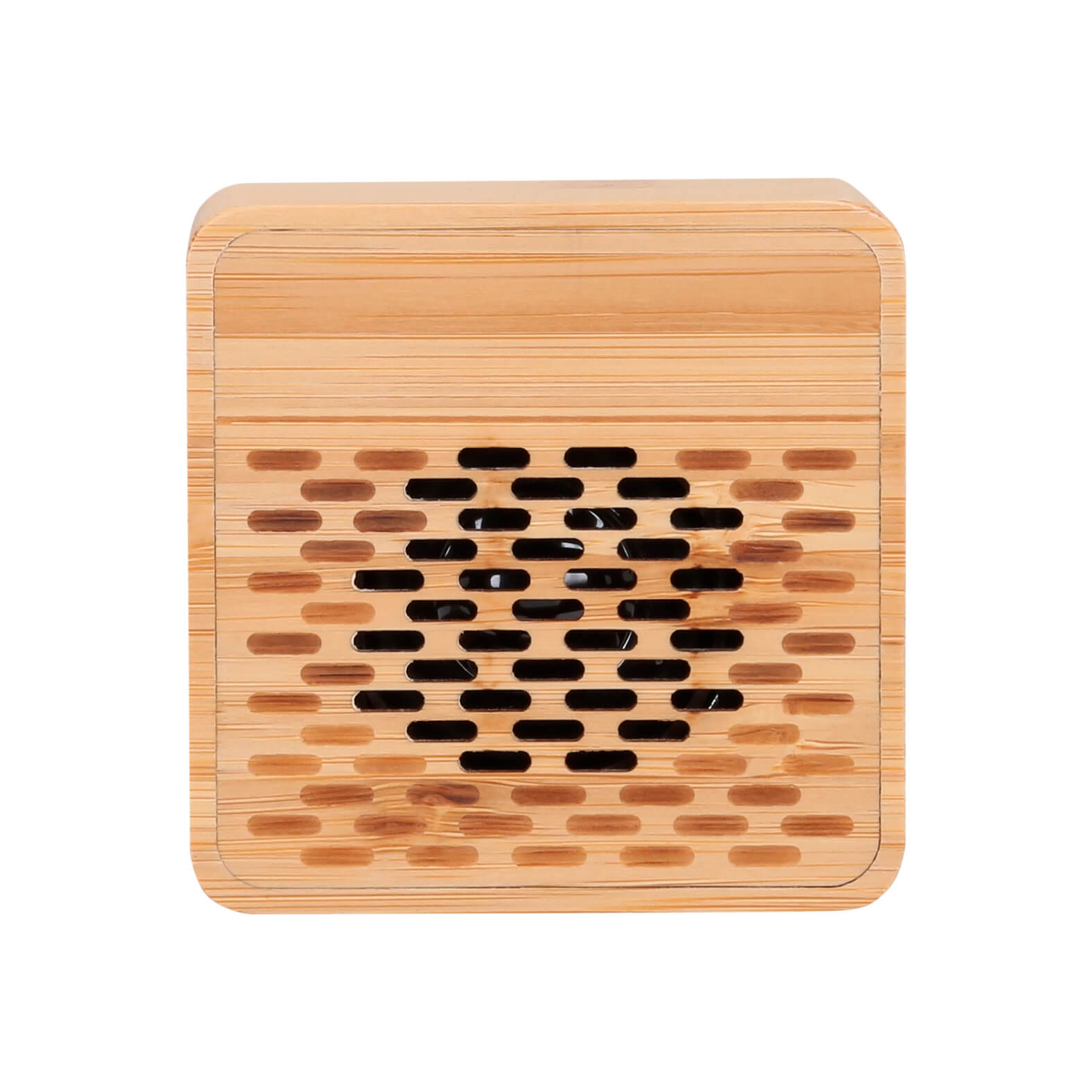 Bocina bluetooth portátil de bambú con botón de encendido y apagado. Incluye cable de carga tipo C.