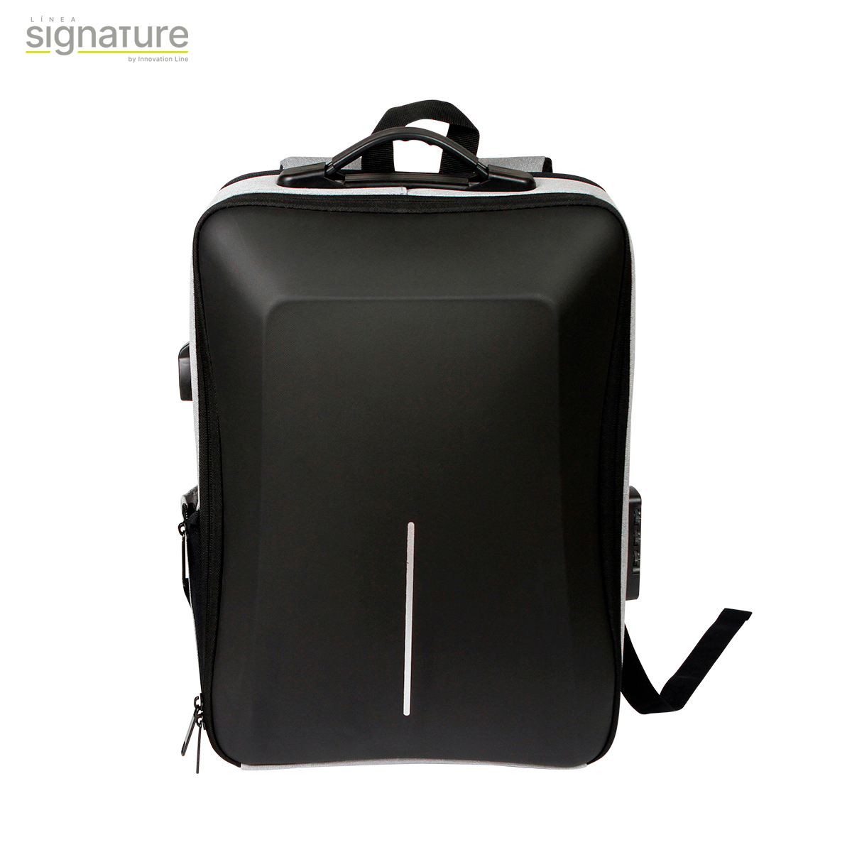 Mochila ejecutiva de viaje fabricada en poliéster, con compartimentos para laptop, equipaje y artículos diversos, candado lateral TSA y correas acolchonadas ajustables, con asas en la parte superior, incluye puerto con salida USB.