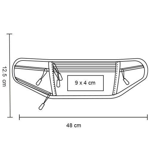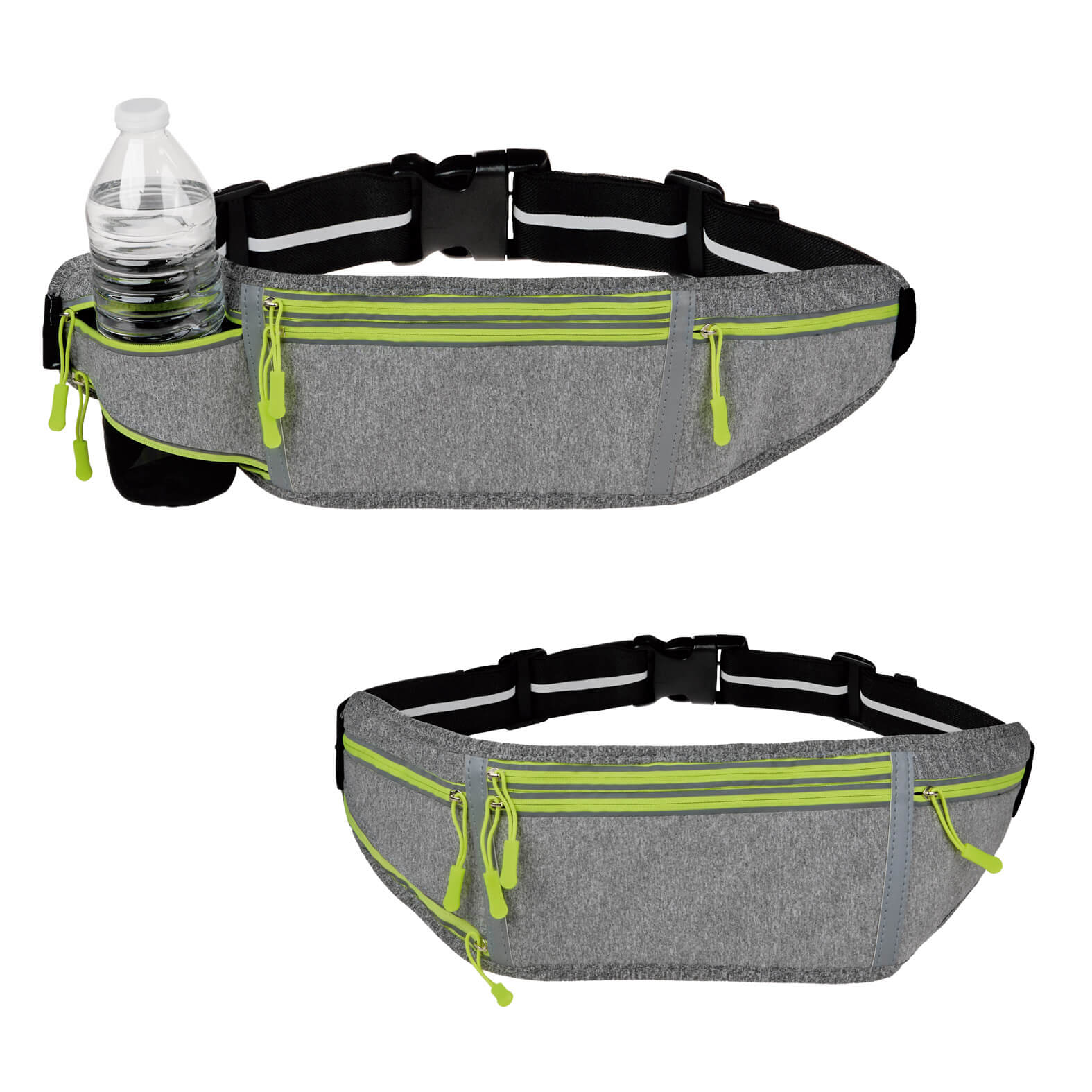 Cangurera de poliéster con tres compartimentos con cierre, un compartimento extensible para botella de agua y banda elástica ajustable con broche.