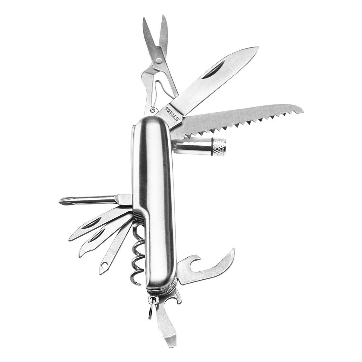 Navaja de bolsillo con 11 funciones. Incluye tijeras, serrucho, sacacorchos, destapador, desarmador con punta de cruz, desarmador con punta plana, navaja grande, 3 navajas chicas, lámpara de 1 LED con 3 baterías de botón (incluidas), llavero y funda.