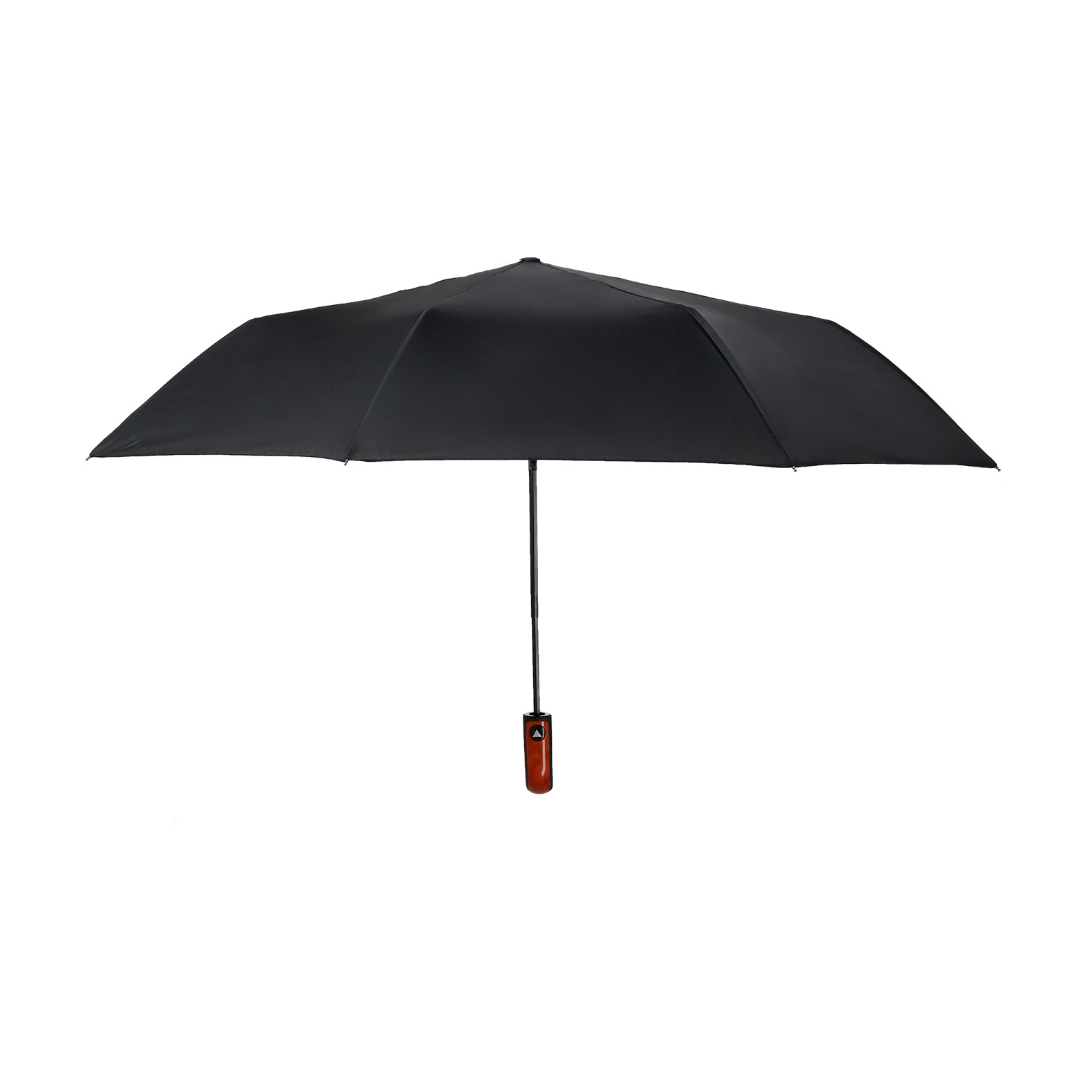 Paraguas de poliéster de 8 gajos con varillas reforzadas, cintilla de seguridad con velcro y mango con botón de sistema de apertura automático. Incluye funda.