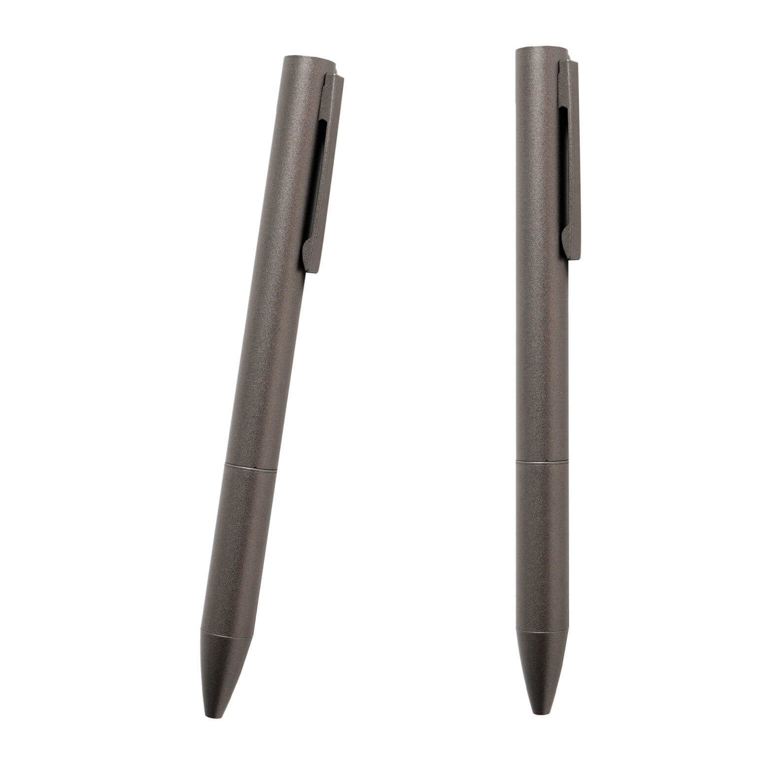 Bolígrafo metálico con clip y mecanismo retráctil.