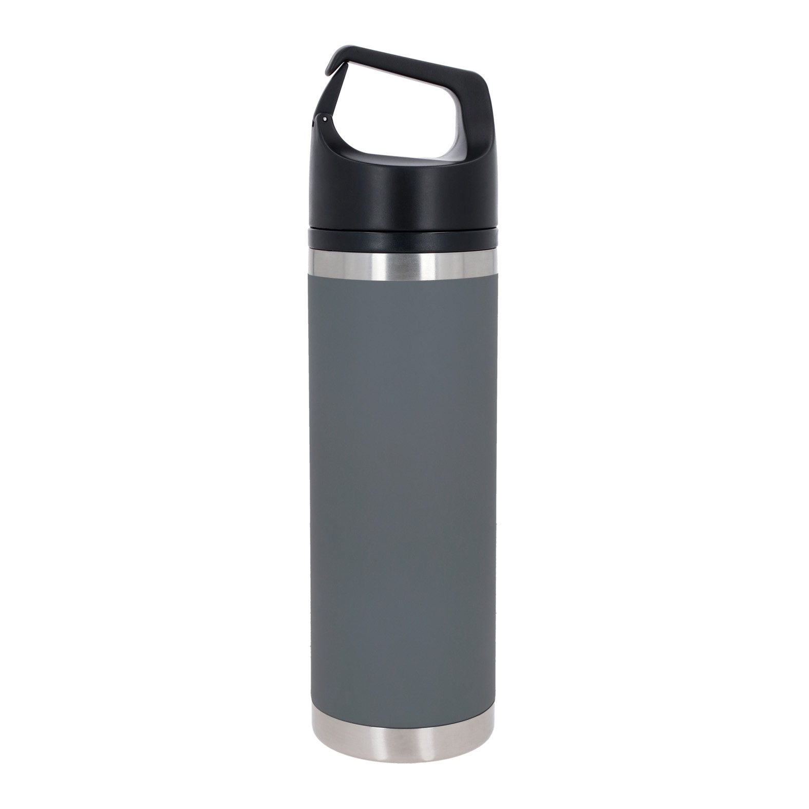 Termo con acabado rubber, doble pared de acero inoxidable, insulado al vacío, con boquilla remobible y tapa de rosca con asa tipo arnés.