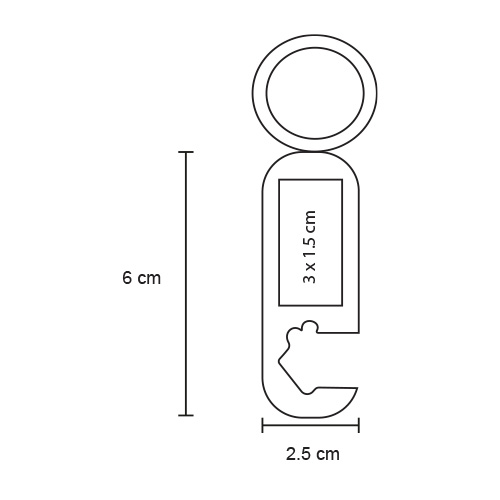 Llavero metálico rectangular con diseño interno en forma de casa que sirve como destapador.