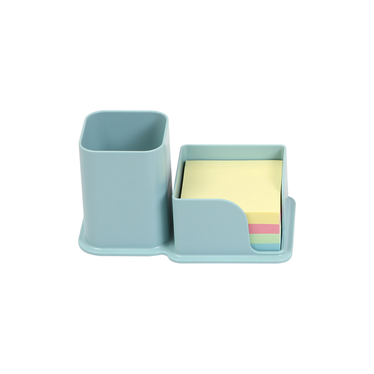 Organizador de escritorio fabricado en poliestireno (PS). Compuesto por porta lápices y notas adhesivas.
