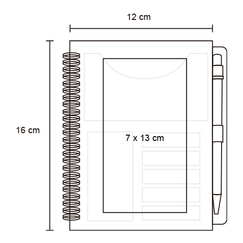 Libreta ecológica de cartón con espiral y plástico protector, incluye: 5 banderas adheribles, bolígrafo, porta tarjetas, block de notas y 70 hojas de raya.