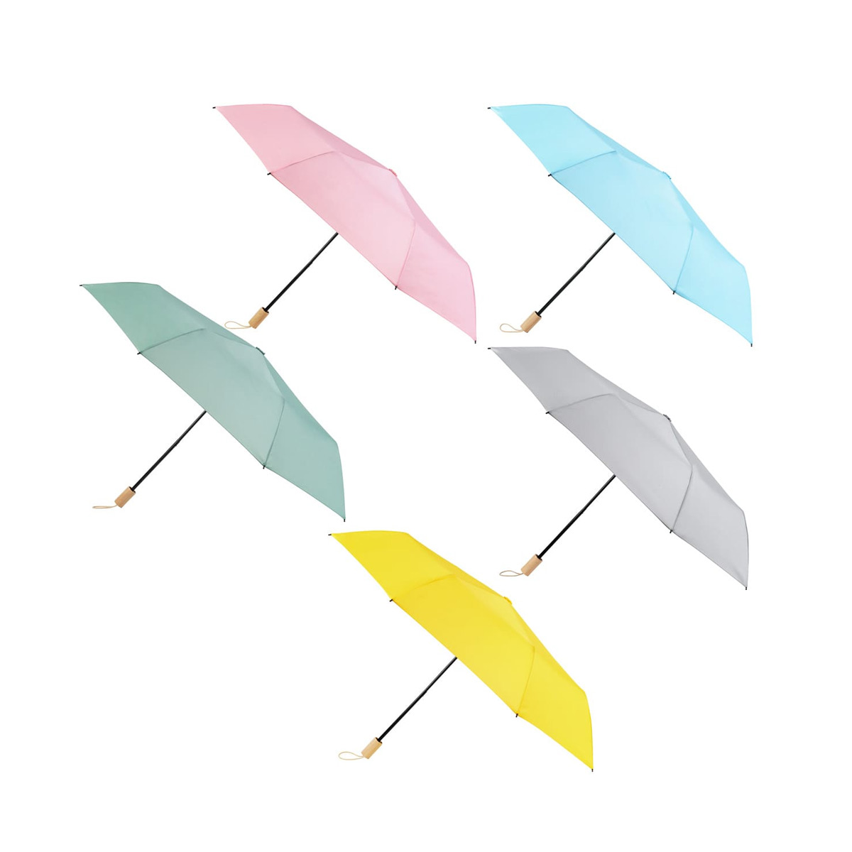 Paraguas de bolsillo de 8 paneles. Sistema de abertura manual. Mango de madera con asa elástica. Incluye funda individual con botón metálico que permite abrir y guardar el paraguas fácilmente.