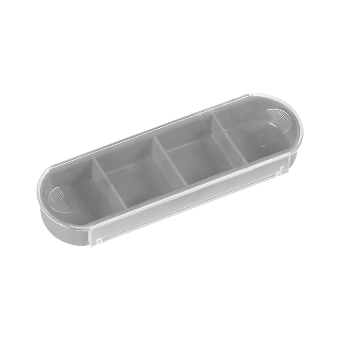 Pastillero fabricado en polipropileno con cubierta transparente de plástico AS, lo que te permite ver fácilmente los medicamentos almacenados en su interior. Cuenta con 4 compartimentos individuales.