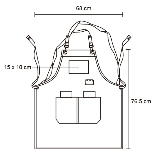 Delantal con dos bolsas frontales, 1 etiqueta frontal y correas ajustables.