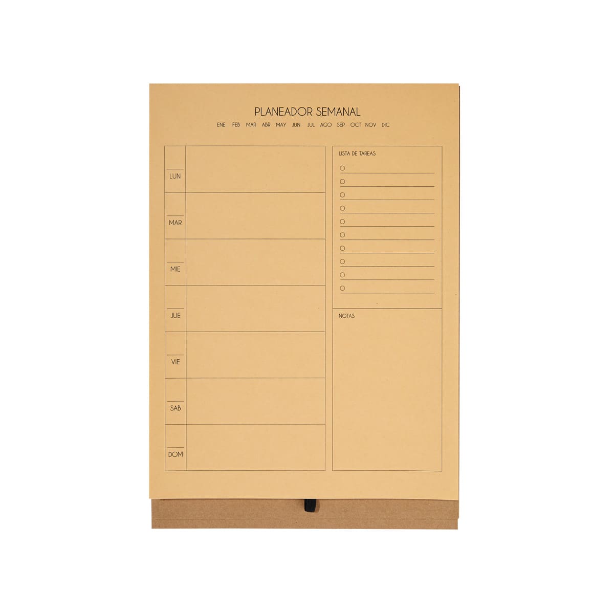 Planeador semanal tamaño profesional de pasta dura. Cuenta con 80 hojas ecológicas y elástico para bolígrafo (no incluido). Organiza fácilmente tus actividades y logra tus objetivos.