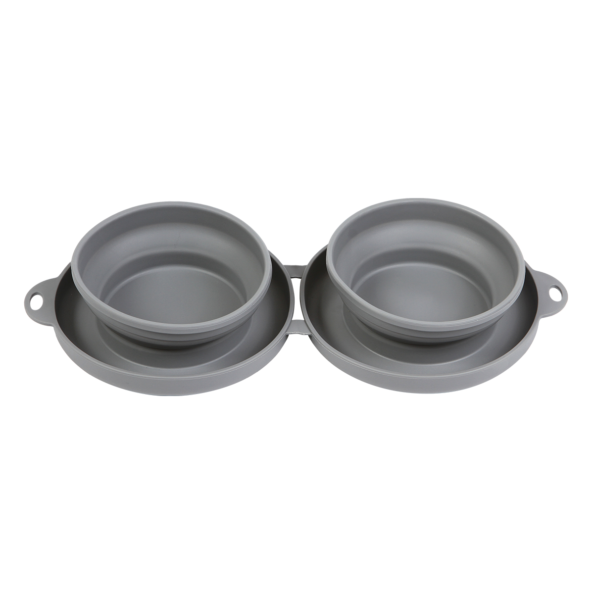 Plato doble compartimento para alimento de mascota fabricado en plástico, con capacidad de 250 ml. Con diseño plegable que facilita su traslado, incluye arnés metálico.