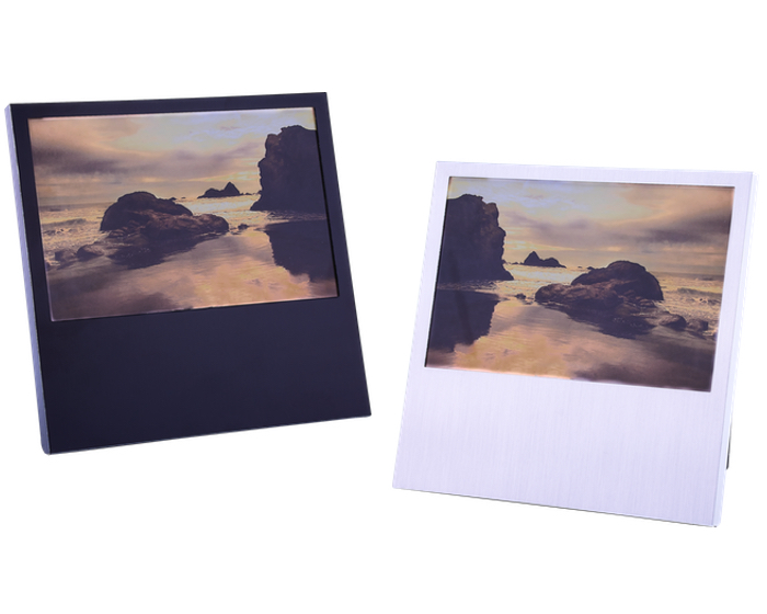 Portarretratos de aluminio con soporte plegable. Se puede acomodar de forma horizontal o vertical. Presentación: caja en color blanco.