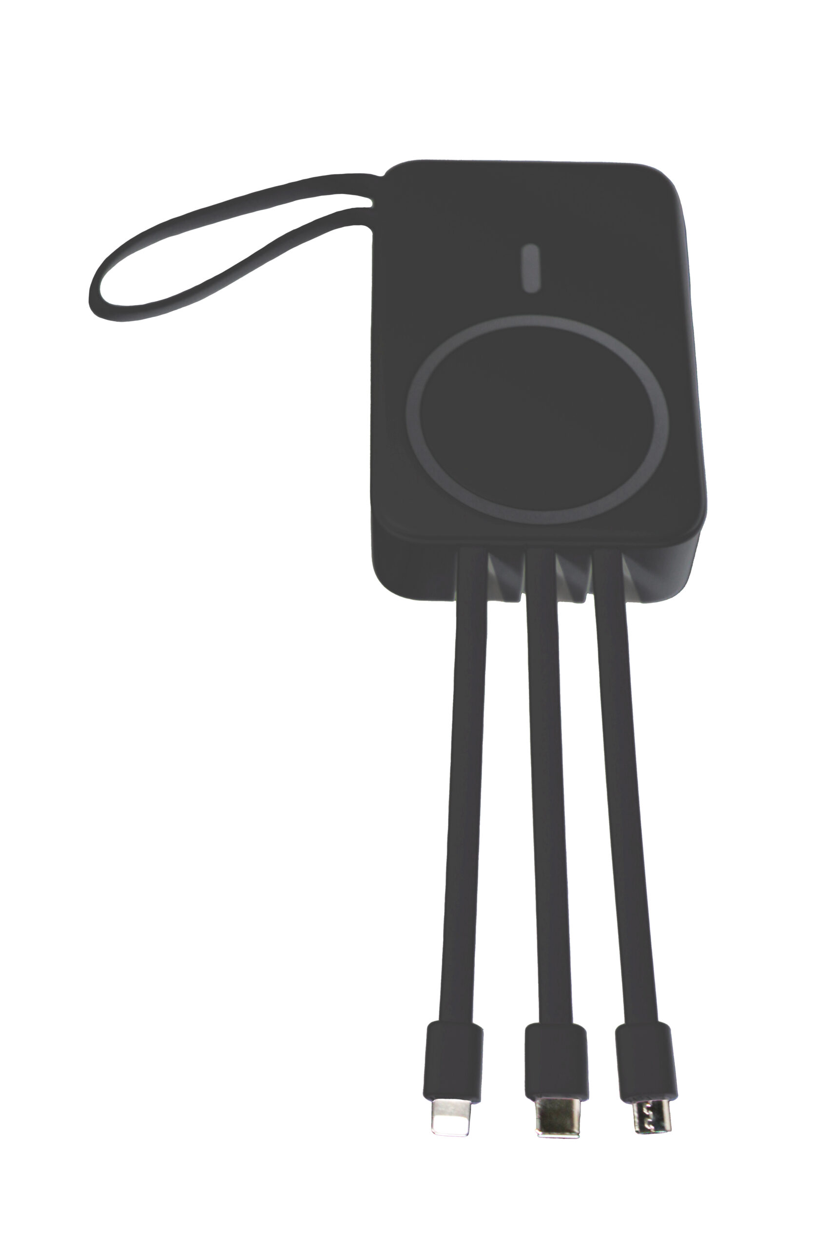 POWERBANK MAGNÉTICO Powerbank magnético de 10,000 mAh con cuatro cables USB: USB tipo C, Micro USB y Lightning. Incluye cable USB tipo C.