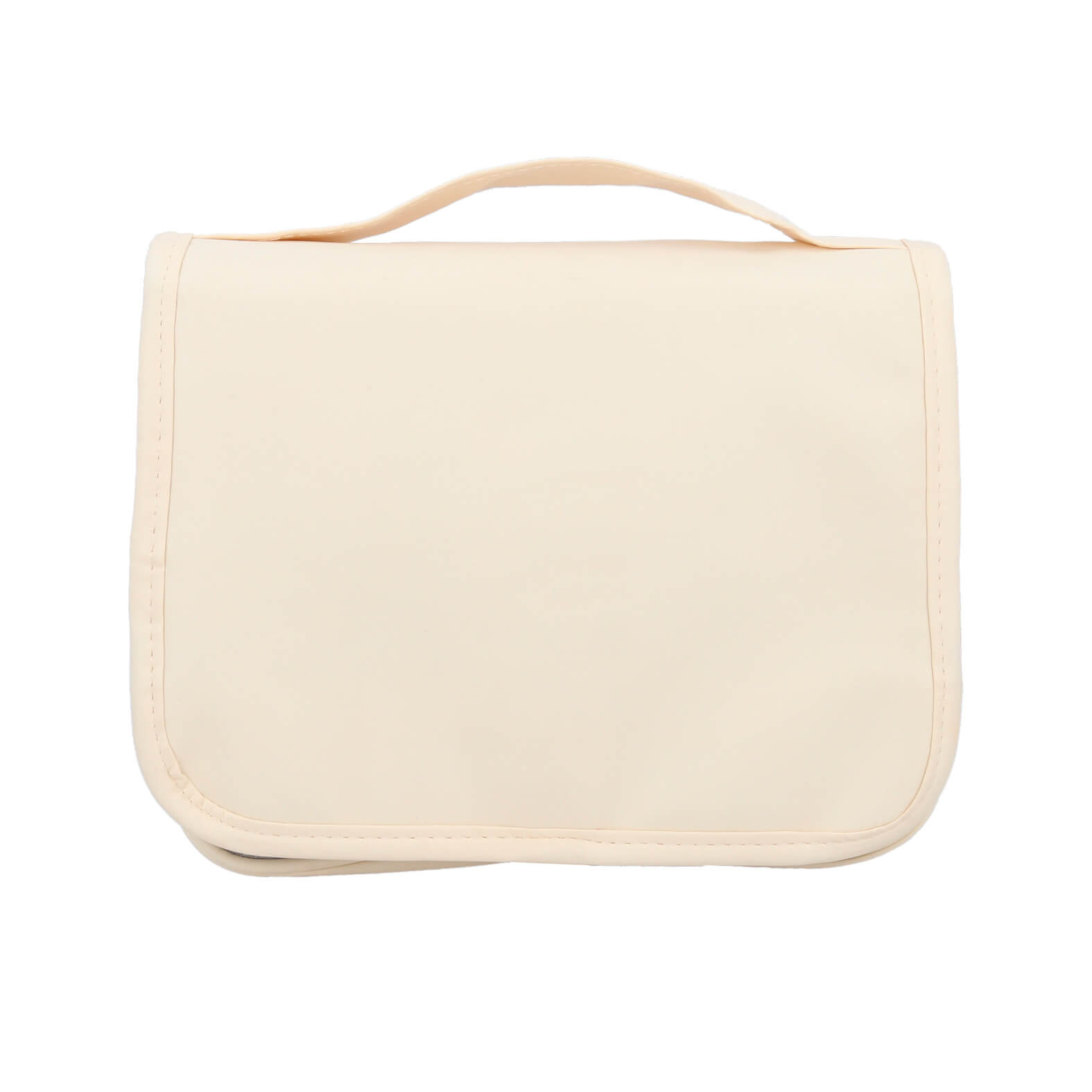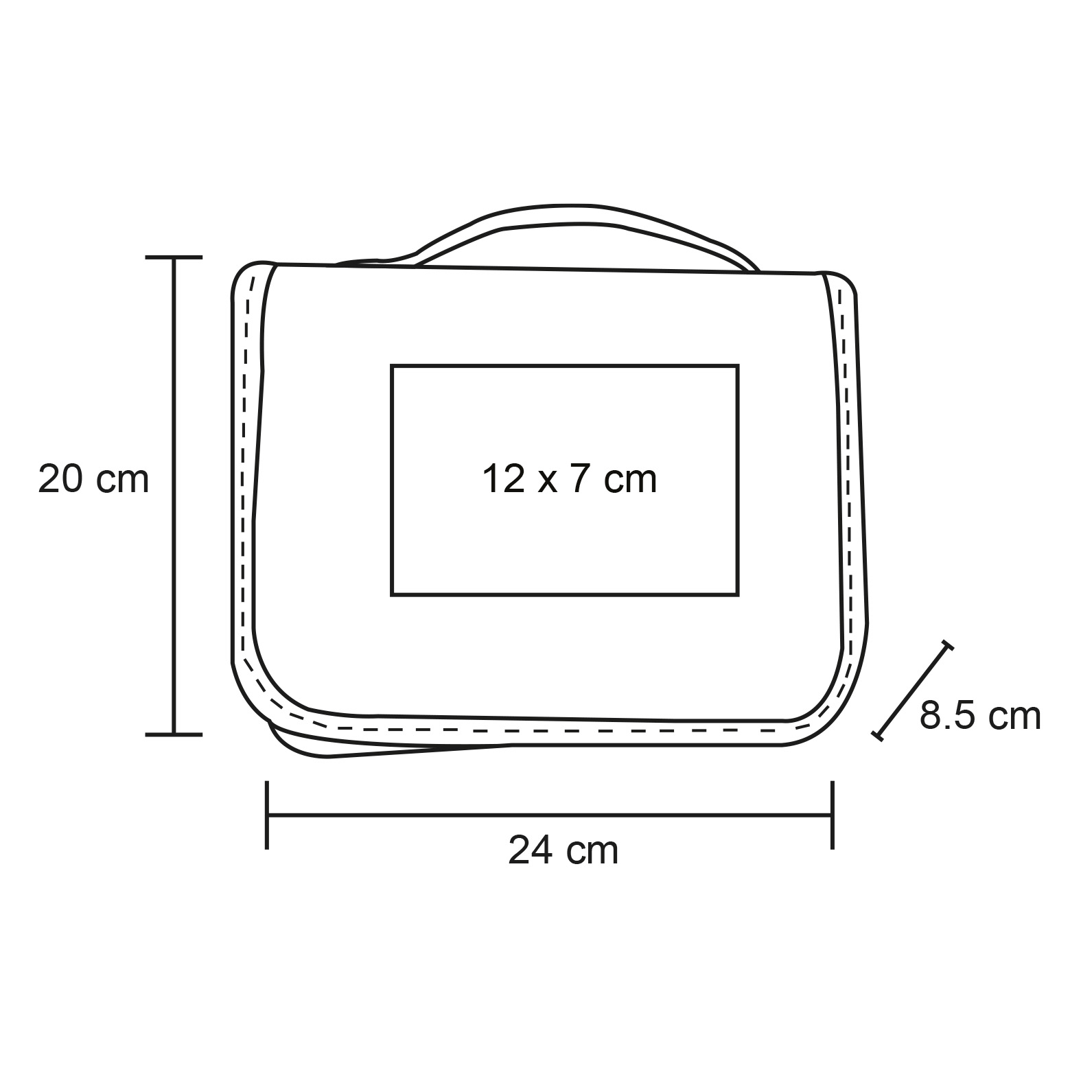 Estuche para viaje de poliéster con 1 compartimento principal con cierre y bolsa al interior, 2 compartimentos con malla, 1 compartimento transparente, gancho de plástico, asa y compartimento trasero.