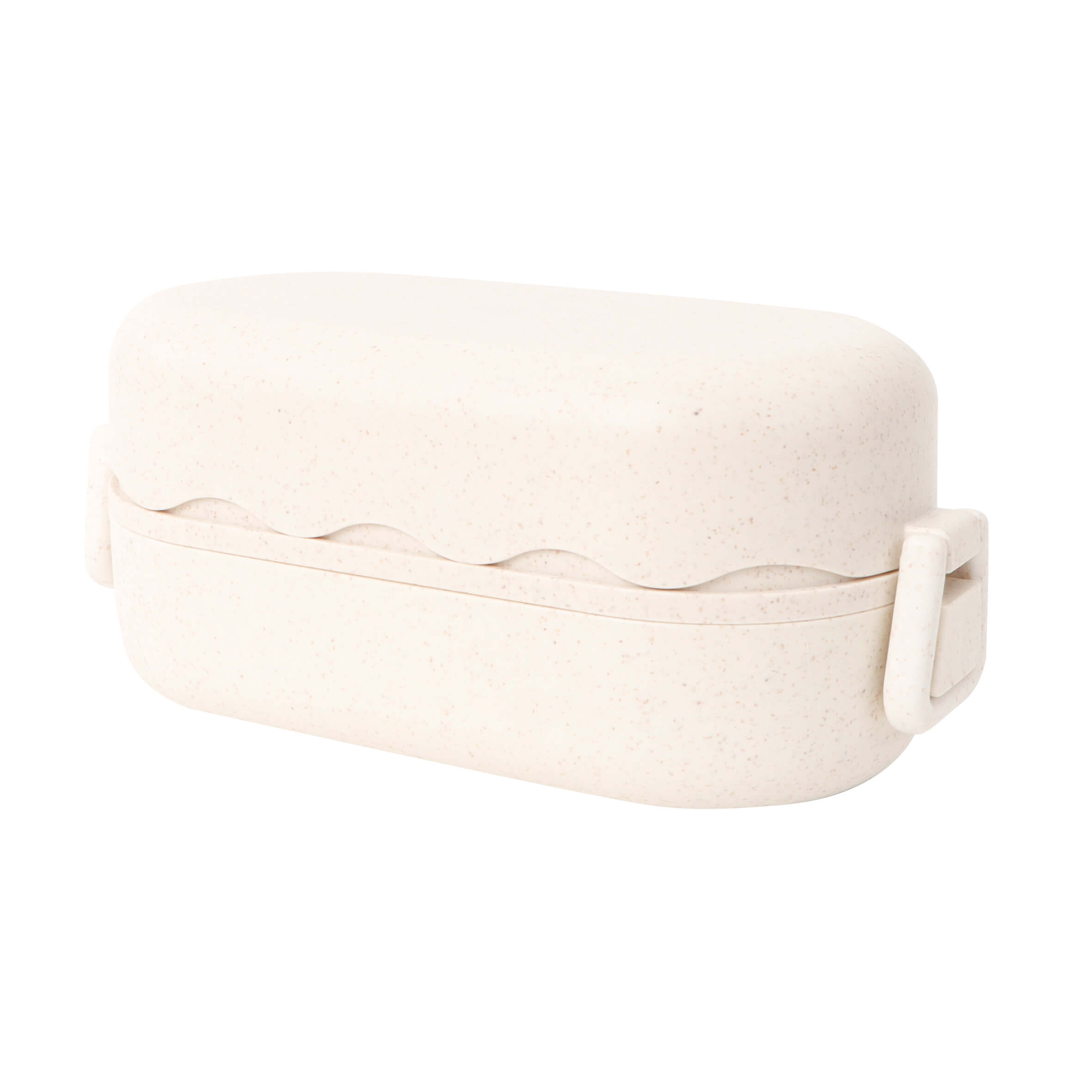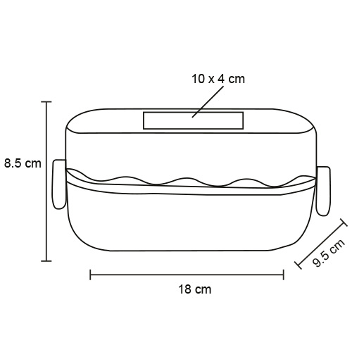 Contenedor de alimentos con dos compartimentos principales, separador de comida, cuchara y broches laterales.