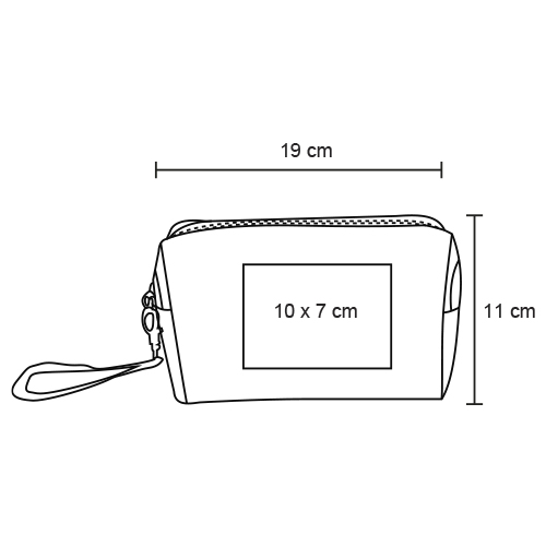 Cosmetiquera de poliéster con apariencia de mármol, interior forrado, cierre y correa.