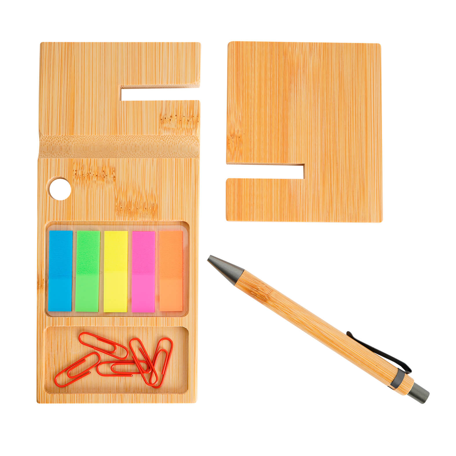 Organizador de escritorio que sirve como soporte para celular, con espacio para banderas adhesivas, clips y bolígrafo.