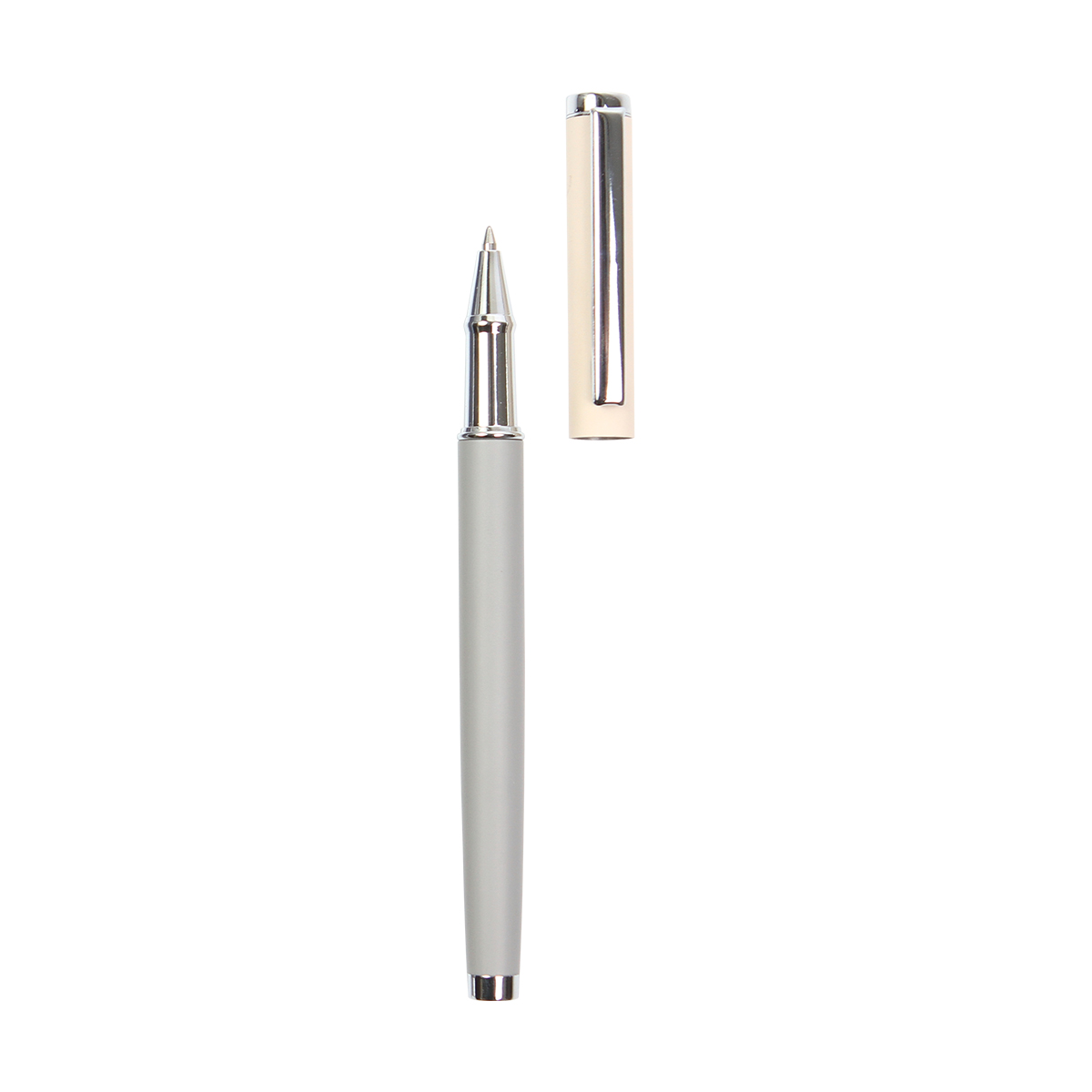 Bolígrafo con mecanismo roll, cuerpo rociado metálico, adornos cromados y recarga de tinta enrollable. Barril fabricado en acero inoxidable. Tinta de escritura azul.