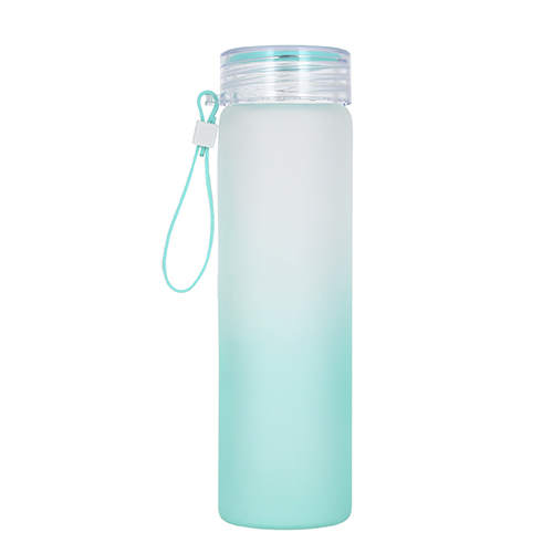 Botella de vidrio para agua con tapa tipo rosca y correa de silicón.
