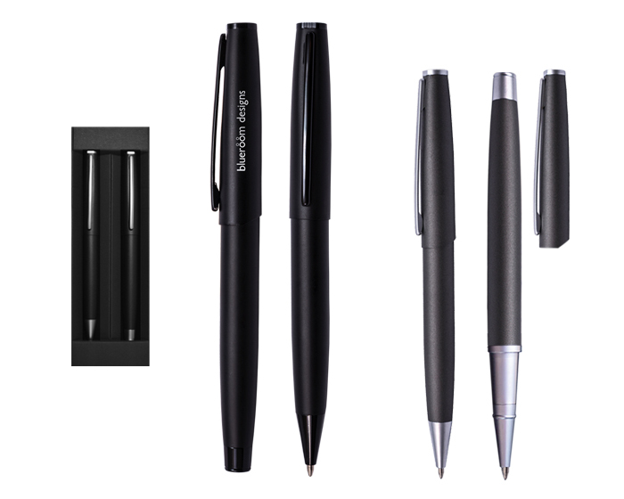 Set de bolígrafos metalicos. Un bolígrafo de punto fino tipo roller con tapa y otro bolígrafo con mecanismo retráctil con clip metálico. Presentación: caja en color negro.