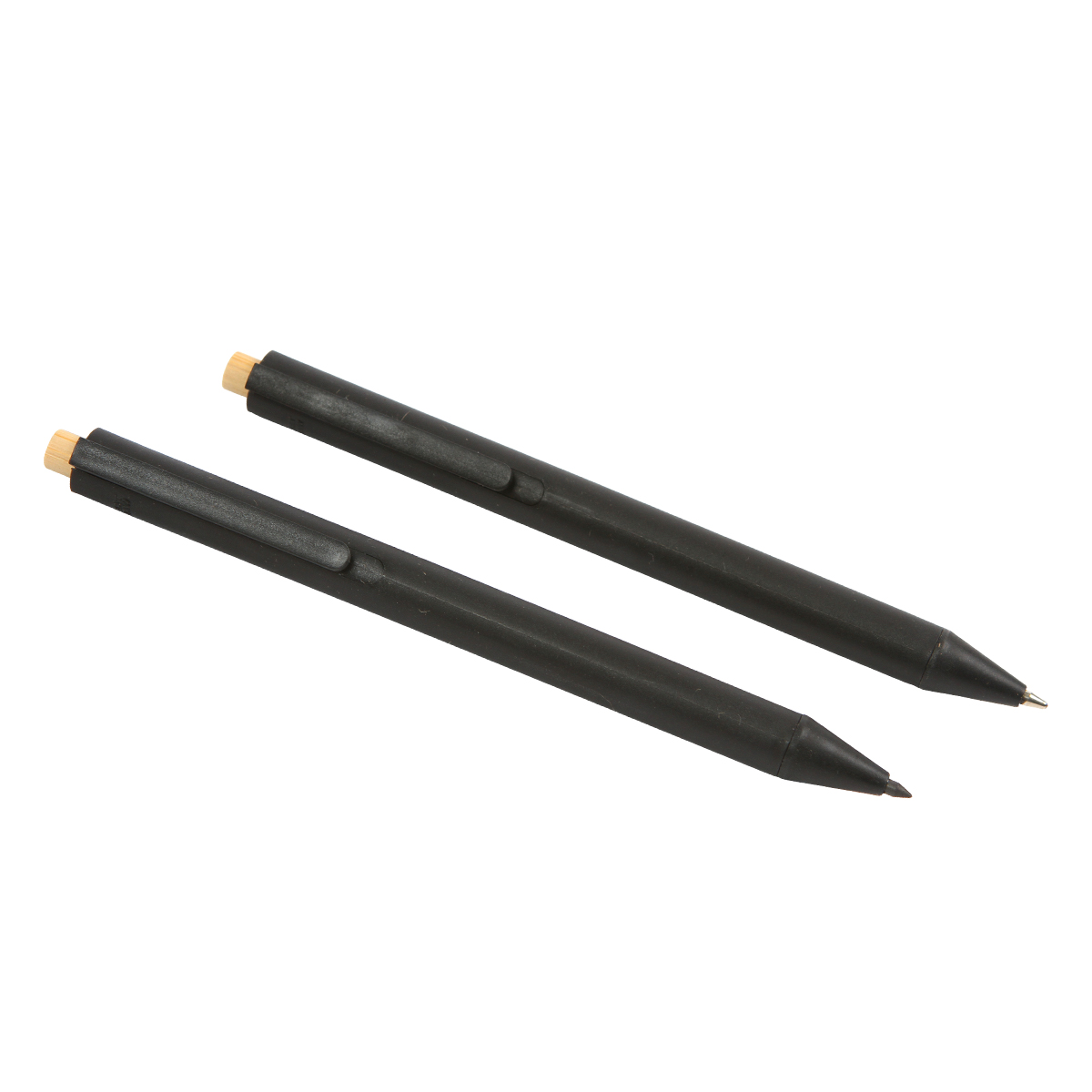 Juego ecológico de un bolígrafo fabricado en ABS y fibra de paja de trigo tinta azul y un lápiz tipo bolígrafo con punta infinita. Sostenibilidad e innovación en tu escritura diaria.