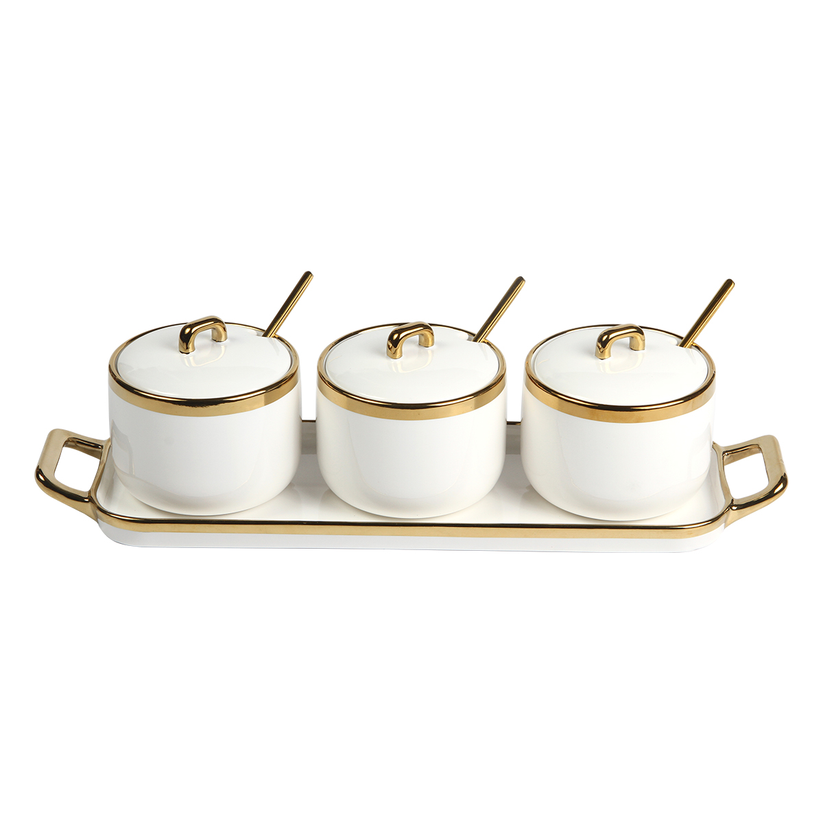 Set de 3 contenedores de cerámica con detalles dorados en las tapa, es una elección sofisticada y práctica para almacenar alimentos. Capacidad de 320 ml, con detalles dorados, y cucharas doradas metálicas incluidas que van a juego con el set.