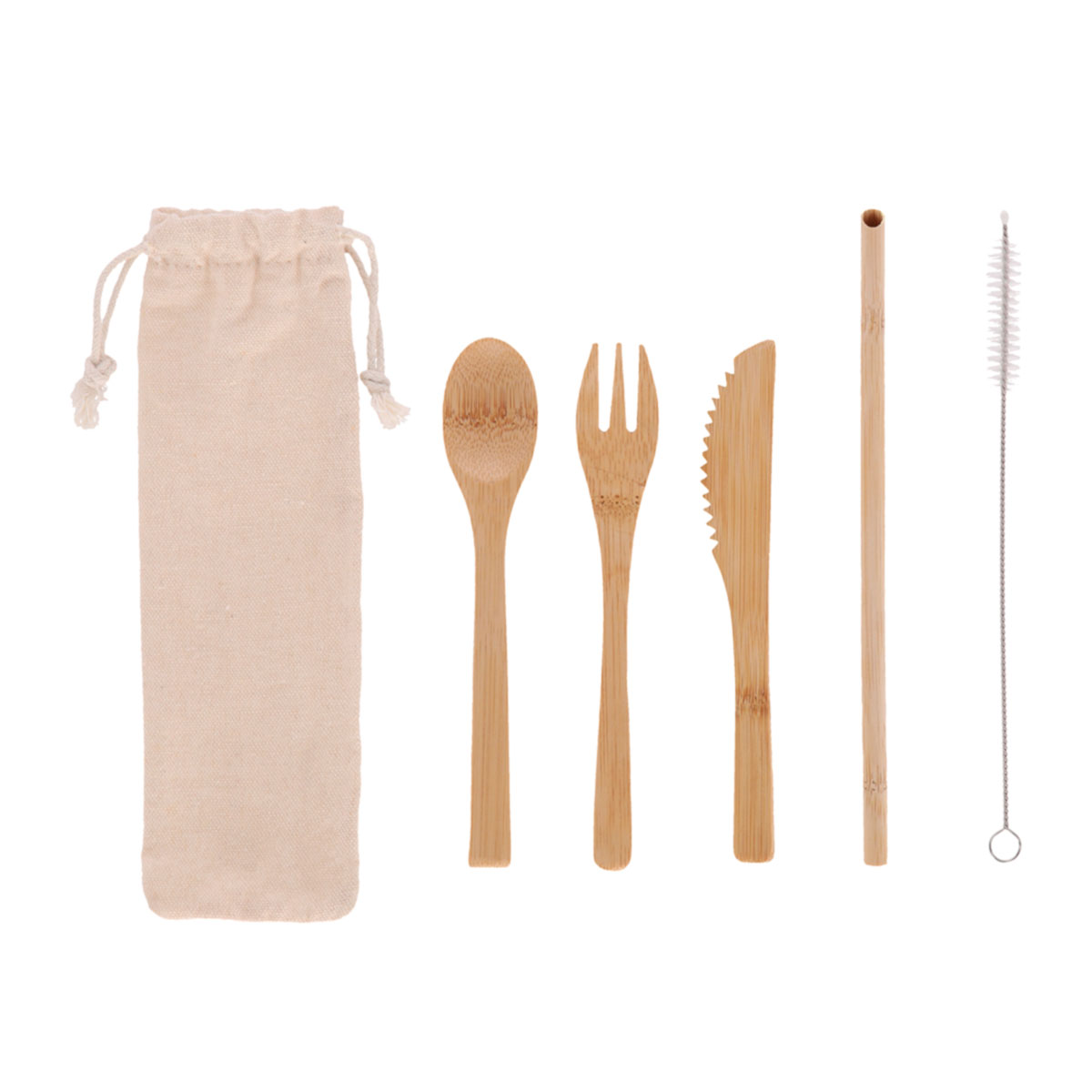 Set de cubiertos de bambú. Incluye tenedor, cuchara, cuchillo, popote, cepillo limpiador y bolsa con jareta.