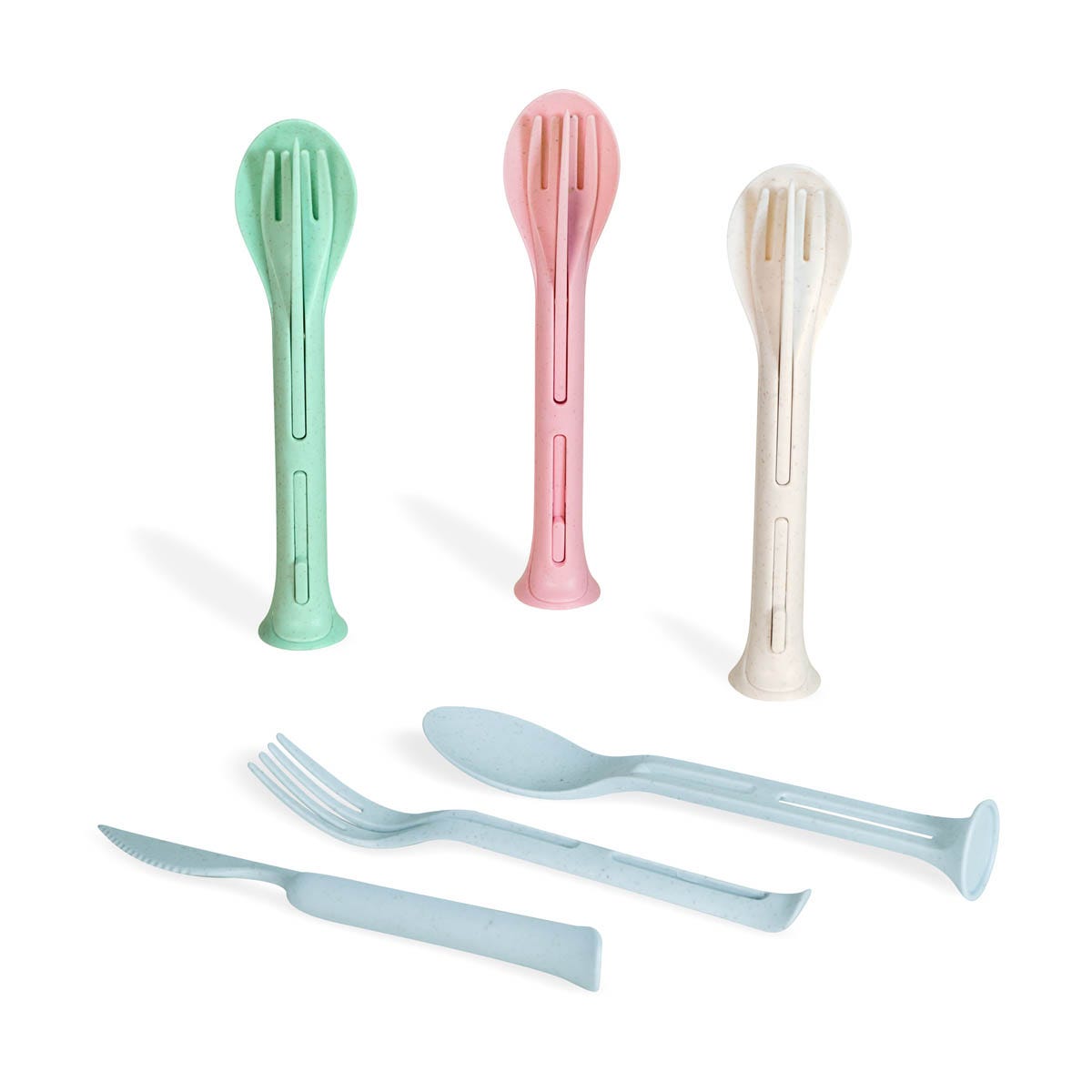 Set de cubiertos 3 en 1 desmontables. Cuenta con cuchillo, tenedor y cuchara. Tiene un peso ligero y es fácil de transportar. Incluye caja individual.