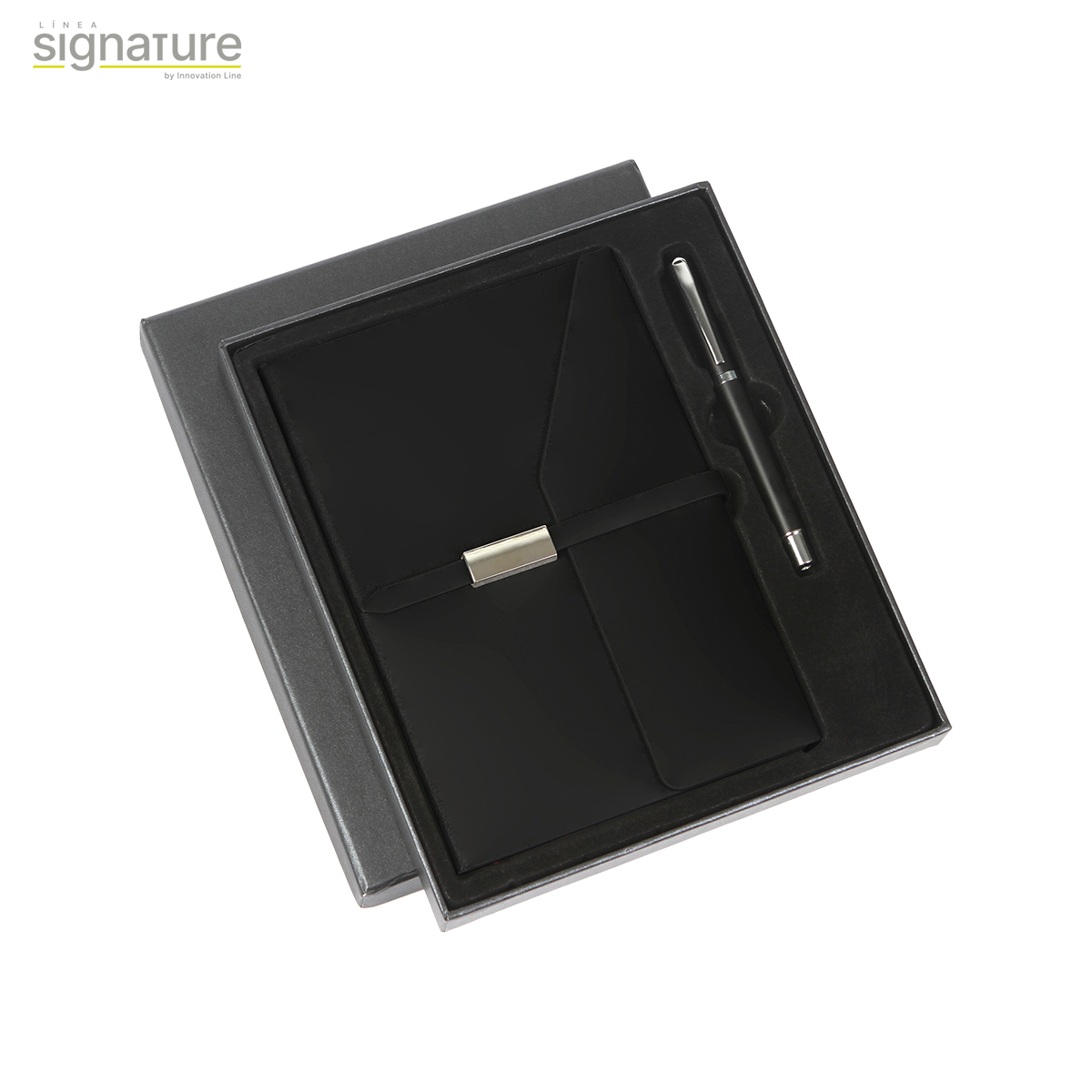 Set de libreta de poliuretano (PU) con libreta de 100 hojas rayadas y bolígrafo de plástico con clip metálico a juego. La libreta cuenta con un detalle de metal para cerrarla de manera fácil. Esta elegante carpeta está confeccionada en curpiel de alta calidad, lo que le proporciona un aspecto lujoso y sofisticado, además de una durabilidad excepcional, además viene acompañada de una elegante caja de regalo, lo que la convierte en una excelente opción para obsequiar.