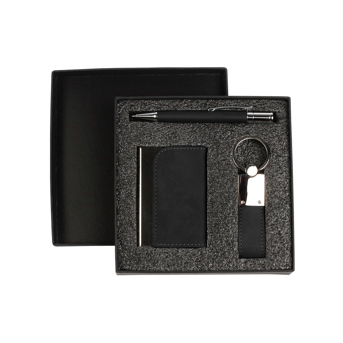 Set fabricado en curpiel y metal, incluye llavero, bolígrafo y porta tarjetas. Bolígrafo tinta negra.